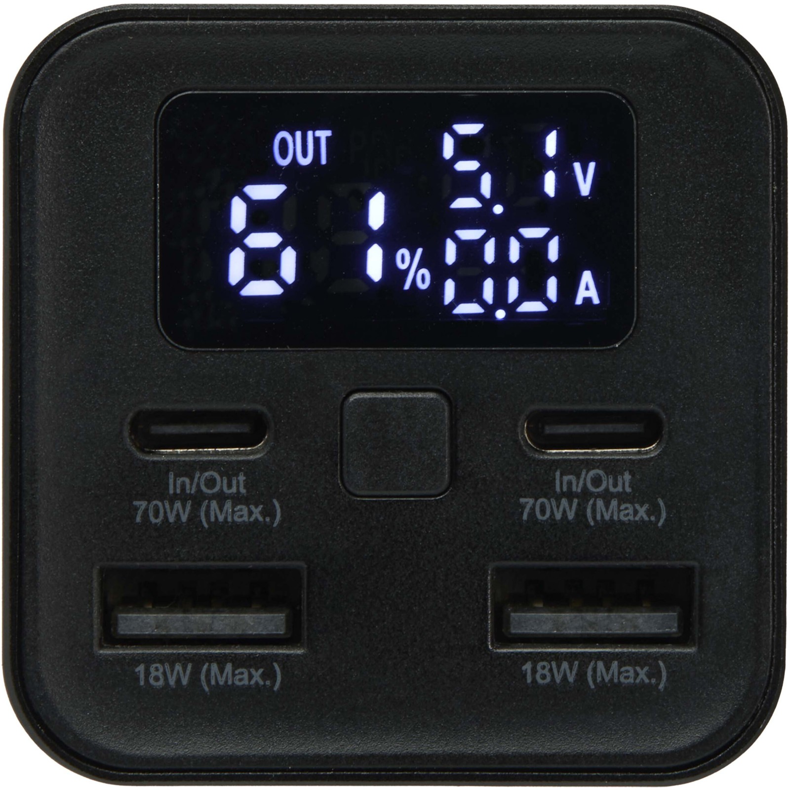Bleiben Sie unterwegs mit der 20.000 mAh Acamar Powerbank aus recyceltem Aluminium stets mit Energie versorgt. Für maximale Vielseitigkeit verfügt sie über zwei leistungsstarke 70W USB-C Anschlüsse und zwei 18W USB-A Anschlüsse – ideal zum Laden von Laptops, Tablets und Smartphones. Das integrierte Display zeigt Echtzeitinformationen wie den Ladestand und die Leistungsabgabe. Ein 70W USB-C Kabel ist im Lieferumfang enthalten – Sie können Ihre Geräte oder die Powerbank direkt aufladen.