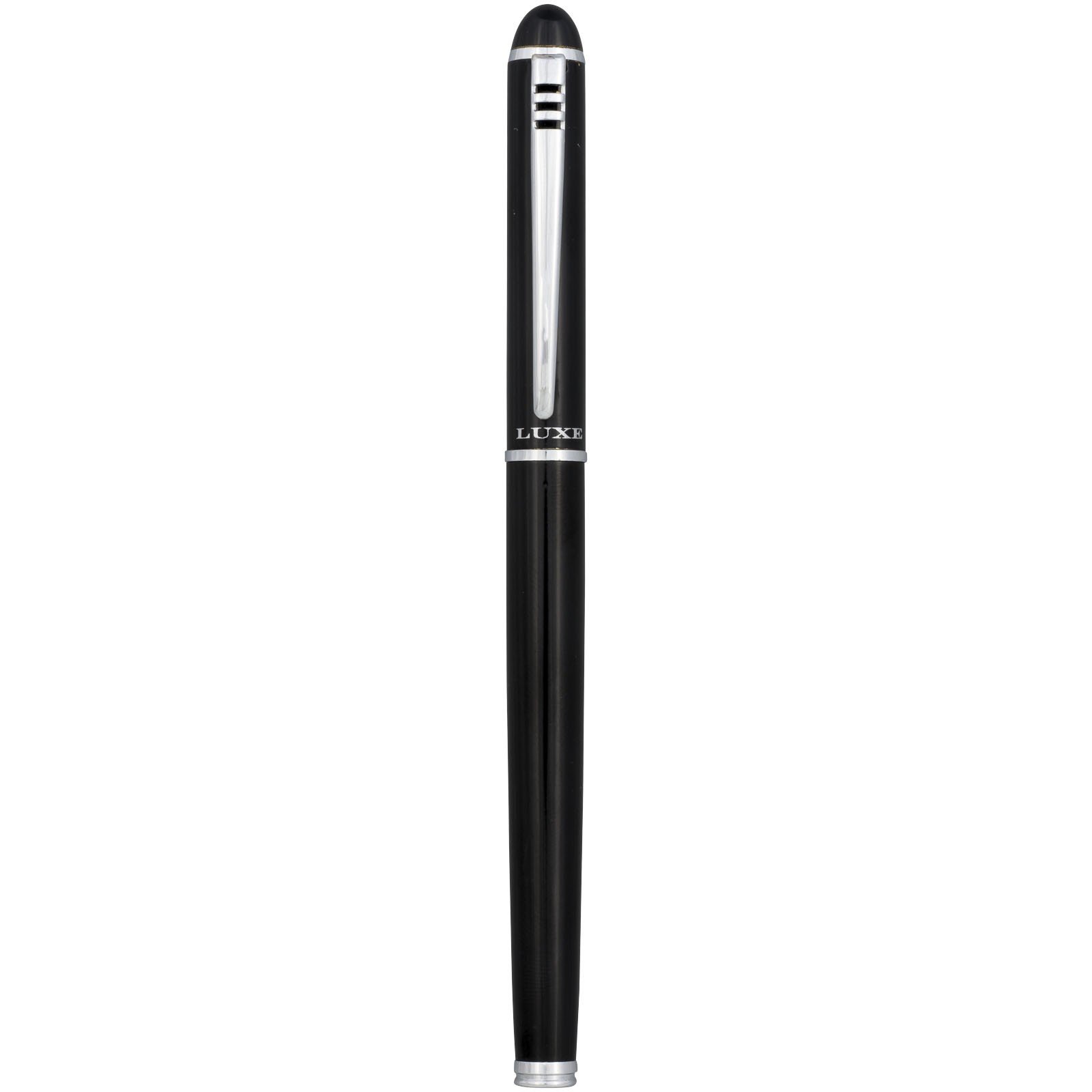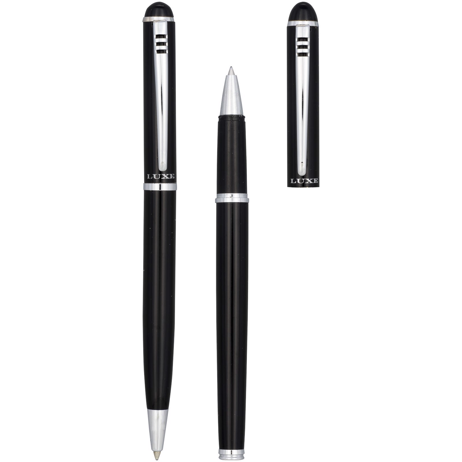 Exklusiv gestaltetes Schreibset aus Kugelschreiber zum Drehen und Tintenroller mit Kappe. Erhältlich in glänzendem Schwarz, mattem Silber und mattem Blau. Verpackt in einer Präsentbox von LUXE.