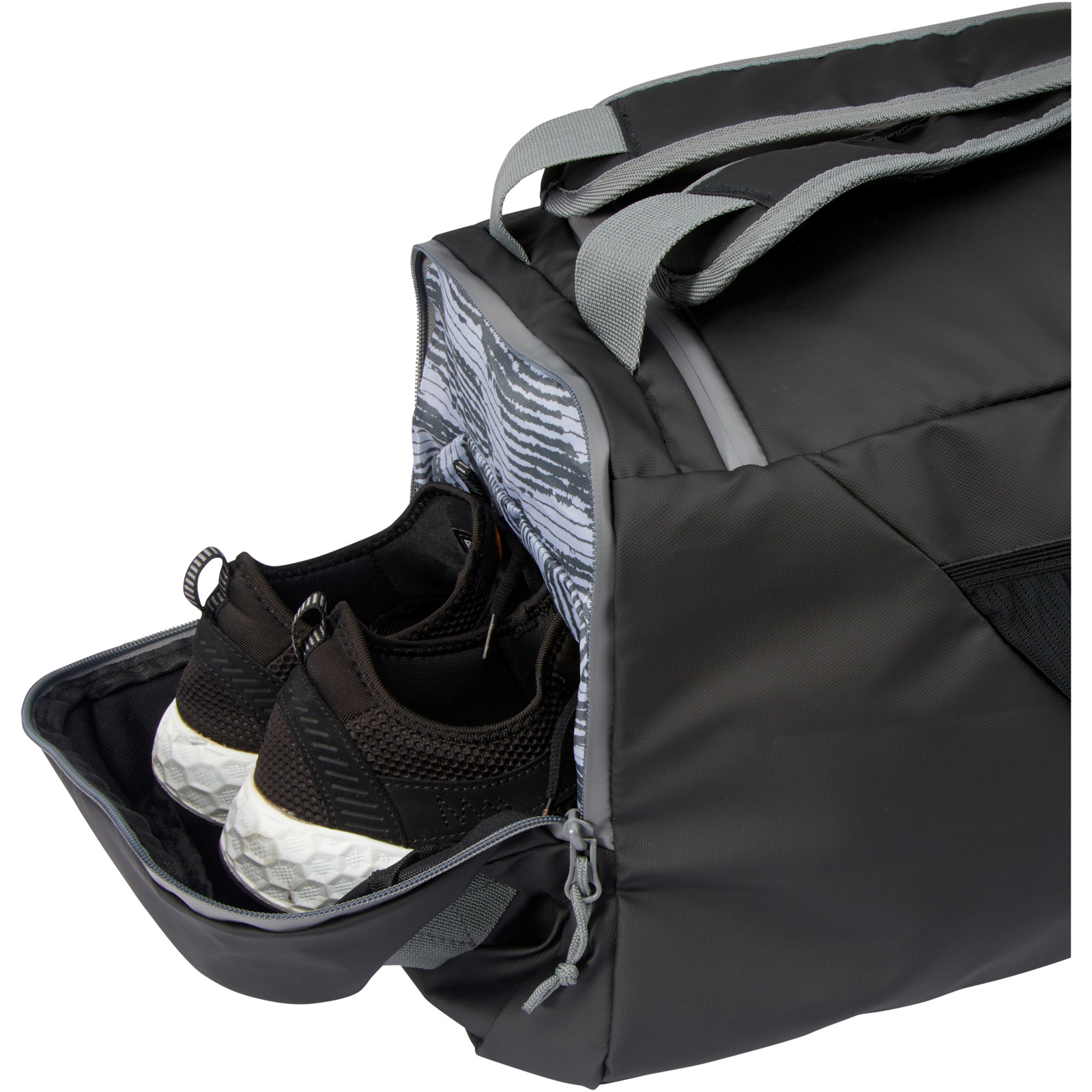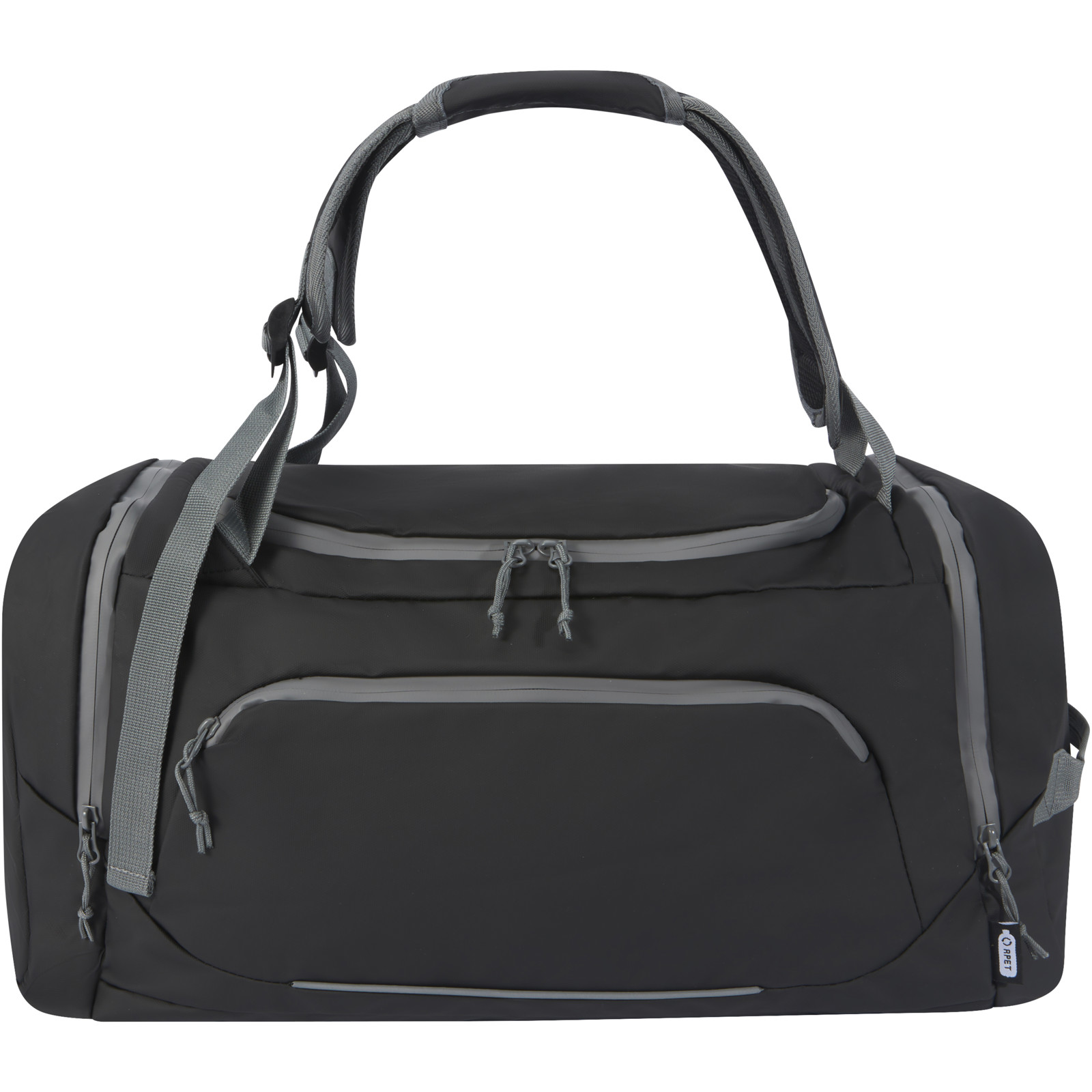 Wasserabweisende 2-in-1 Reisetasche aus GRS-zertifizierten, recycelten Materialien, einschließlich der Reißverschlüsse. Sie verfügt über ein geräumiges Hauptfach mit U-förmiger Öffnung für einfachen Zugriff, zwei seitliche Reißverschlusstaschen (eine davon für Schuhe), eine Reißverschlusstasche auf der Vorderseite, eine Netztasche für die Wasserflasche auf der Rückseite und reflektierende Paspeln für bessere Sichtbarkeit. Die Tasche kann auf 3 verschiedene Arten getragen werden: In der Hand, über der Schulter oder als Rucksack mit gepolsterten und verstellbaren Schulterriemen. Der Hauptstoff, das Futter, die Gurte und die Reißverschlüsse bestehen aus recyceltem GRS-Material. Kapazität: 35 Liter. PVC frei.