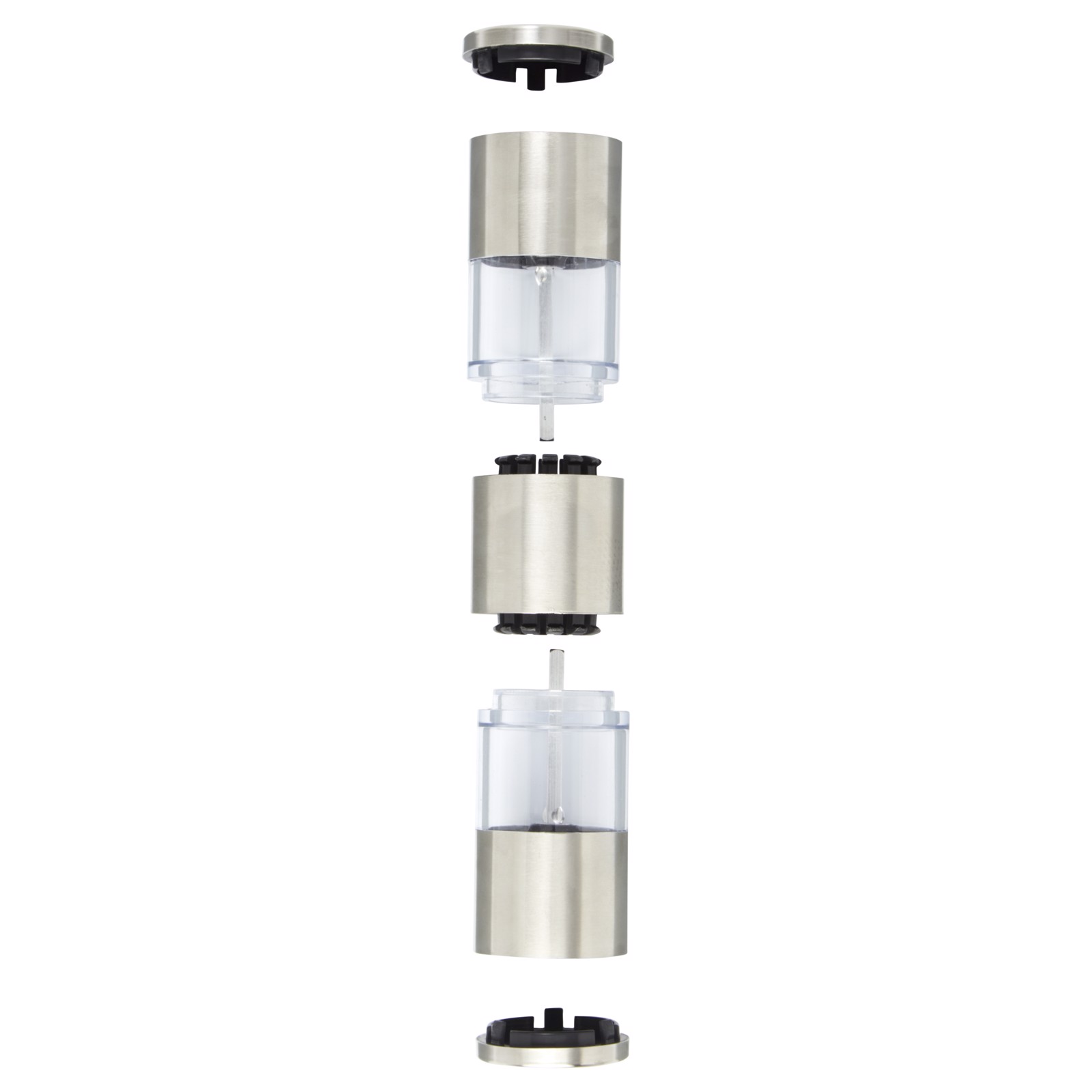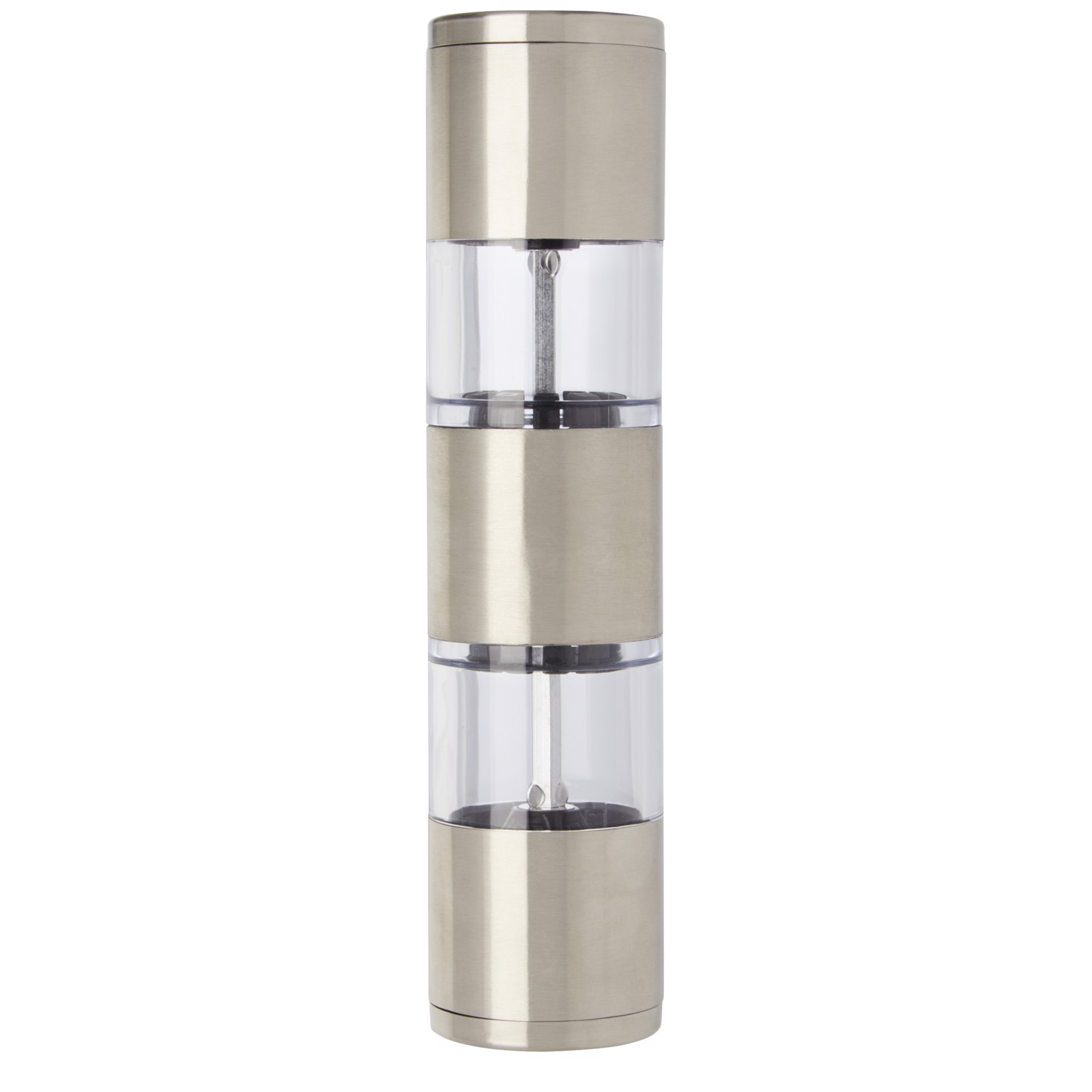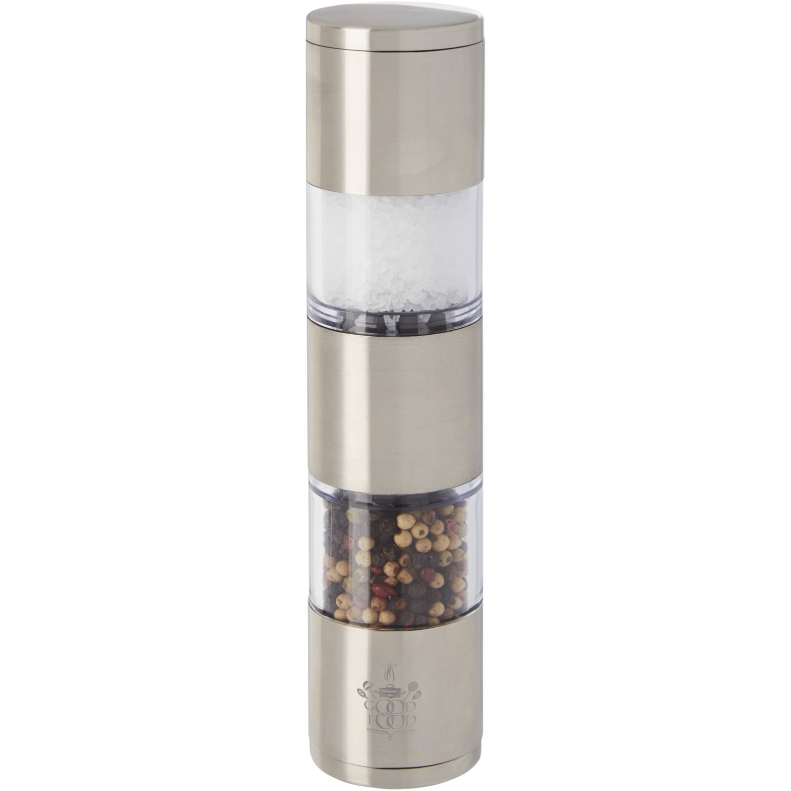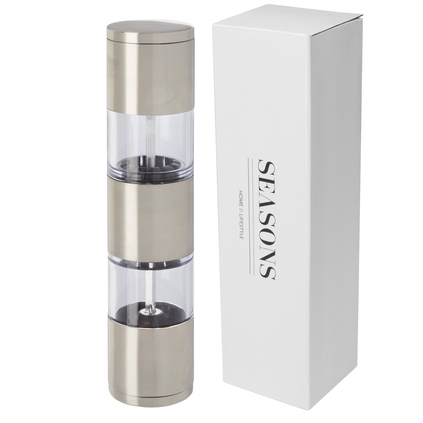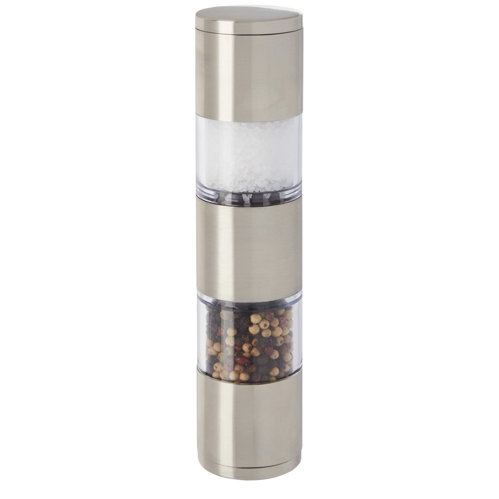 Zweiseitige Mühle mit einem Ende für Salz und dem anderen für Pfeffer. Pfeffer und Salz sind nicht enthalten. Fasst ca. 50 g Salz und ca. 36 g Pfeffer. Fassungsvermögen: 80 ml.