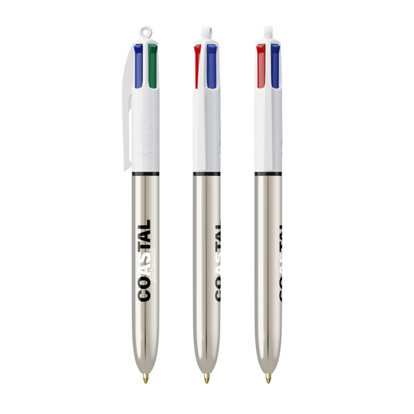 Der kultige BIC® 4 Colours® in glänzenden Metallicfarben. Er verfügt über 4 Standardtinten: blau, schwarz, rot und grün. Unser ikonischer BIC® 4 Colours® wird immer nachhaltiger, da er jetzt 13 % weniger Plastik auf der Oberseite enthält! Zwischen Juni 2023 und Juni 2024 können Sie Ihre Bestellung mit dem Standardclip oder dem neuen Clip mit weniger Kunststoff erhalten.