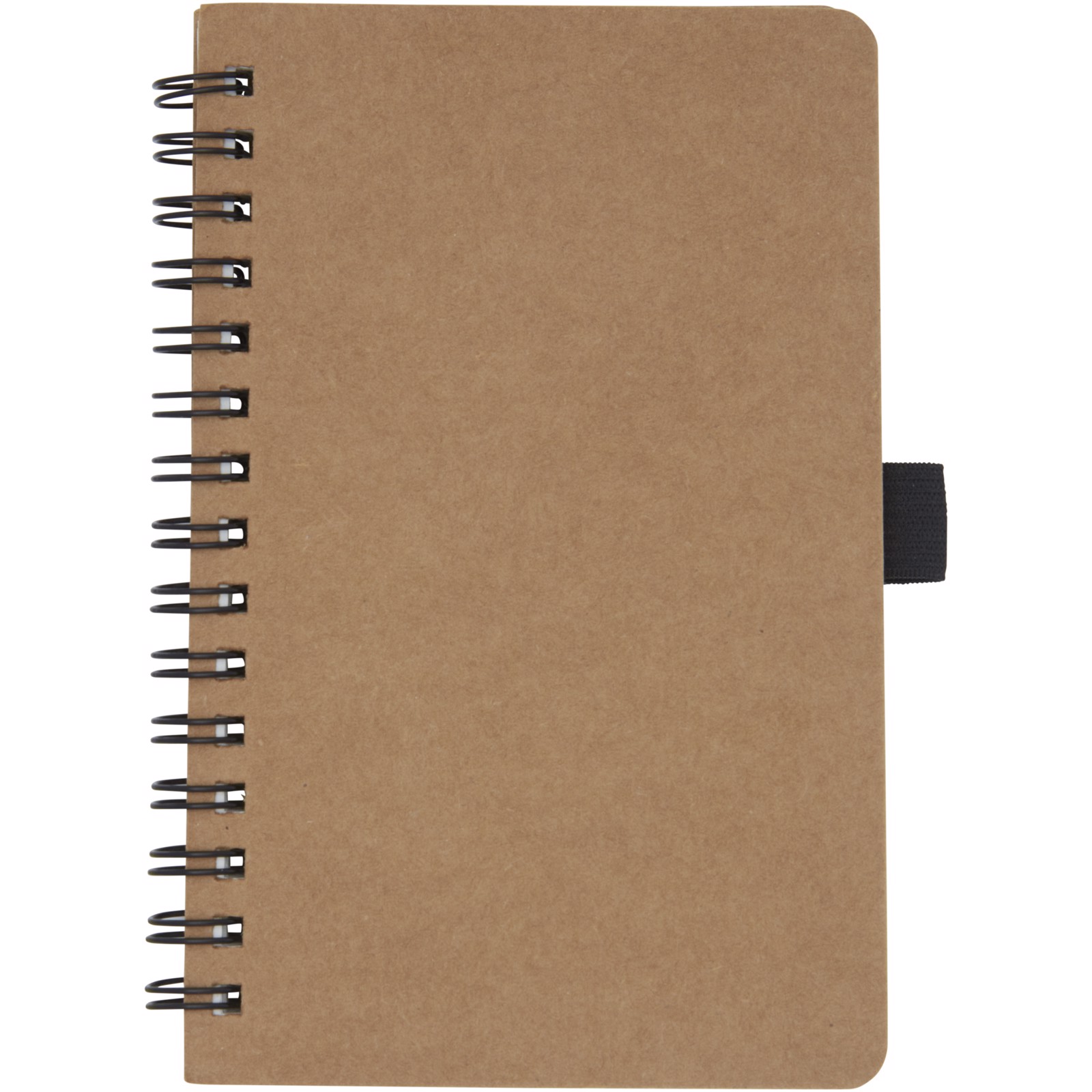A6 Notizbuch mit Spiralbindung aus recyceltem Karton mit Stiftschlaufe. 70 Blatt, 60 g/m² linierte Inhaltsseiten aus Steinpapier Steinpapier ist 100 % holzfrei und der Produktionsprozess verbraucht weniger Energie als recyceltes oder neues Zellstoffpapier. Das Papier ist wasser- und reißfest und hat eine natürliche weiße Farbe (keine Bleichmittel eingesetzt).