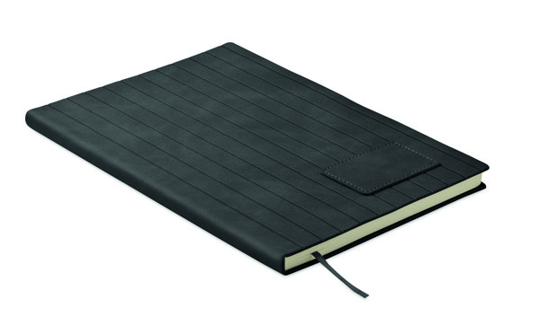 DIN A5 Notizbuch mit geripptem Soft Cover aus 40% recyceltem Post Consumer Smokey PU und 60% PU mit PU Patch. 80 Blatt (160 Seiten) 70 g/m² Recyclingpapier. Farblich passendes Lesebändchen.