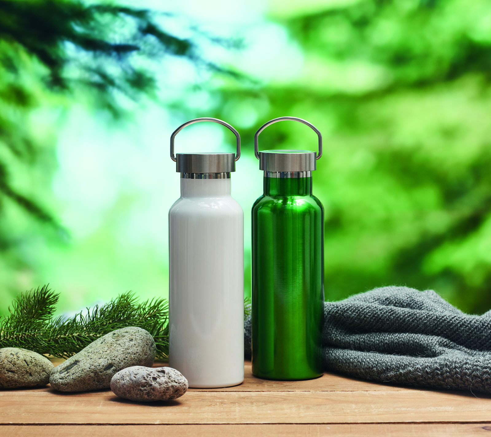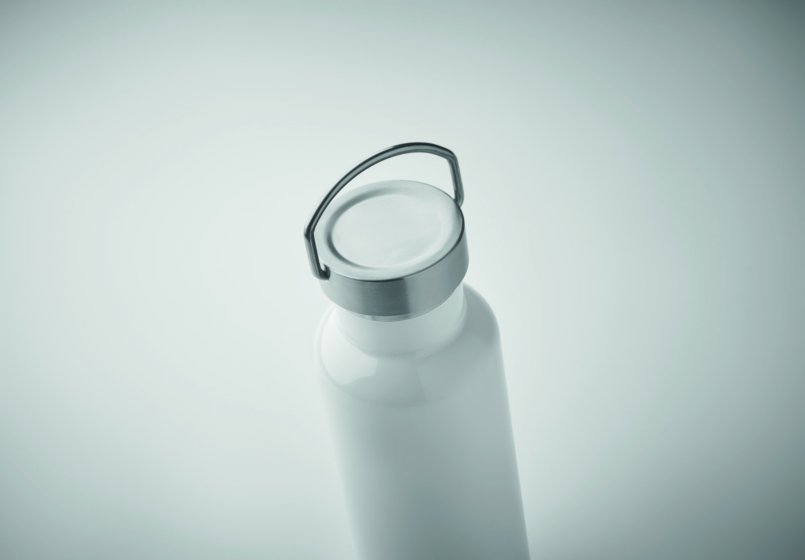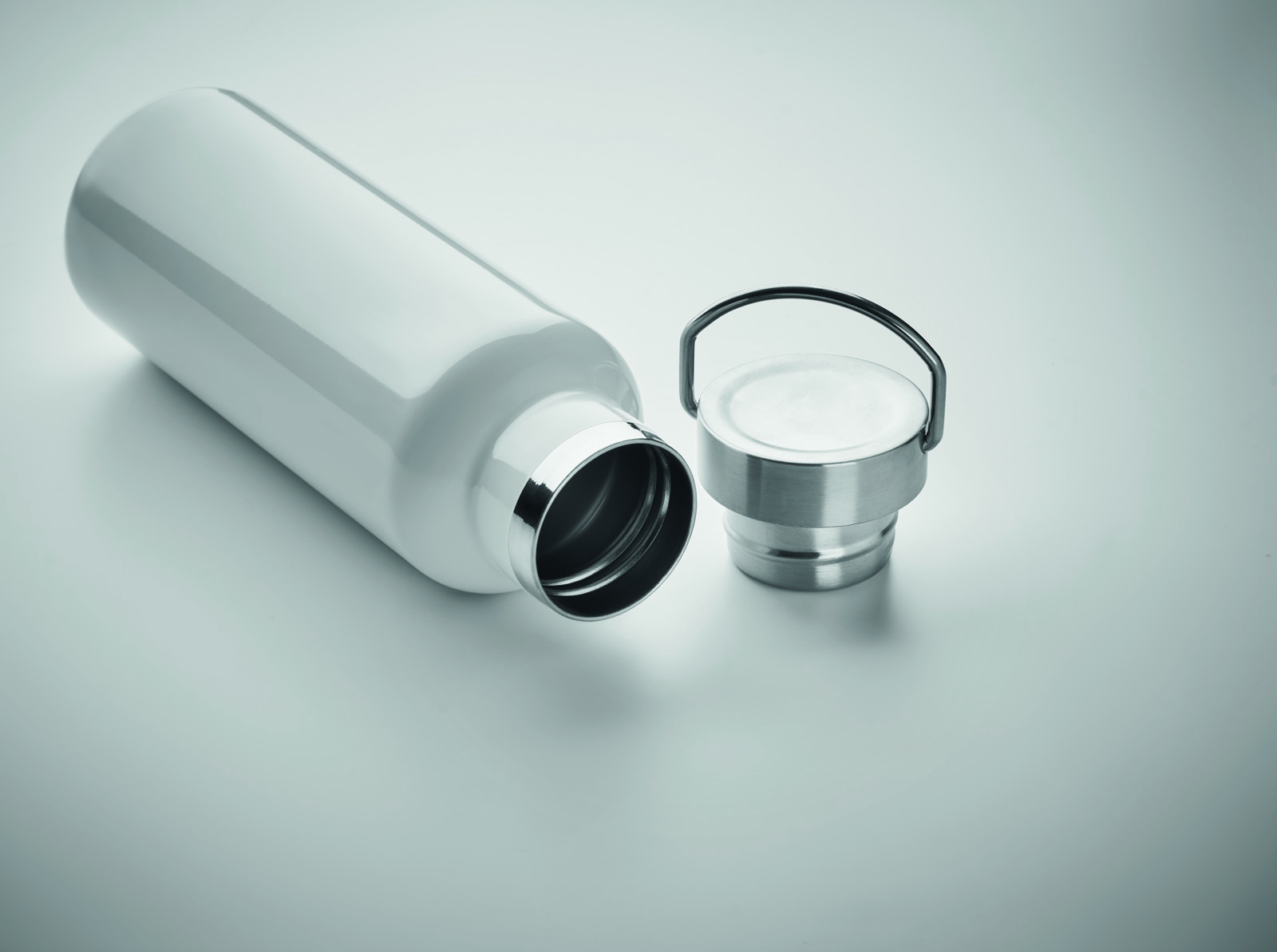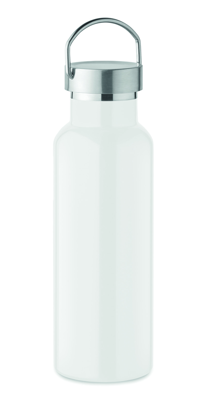 Doppelwandige Isolierflasche aus recyceltem Edelstahl (90 % recycelter Edelstahl und 10 % Edelstahl). Verschluss mit Henkel. Füllmenge: 500 ml.