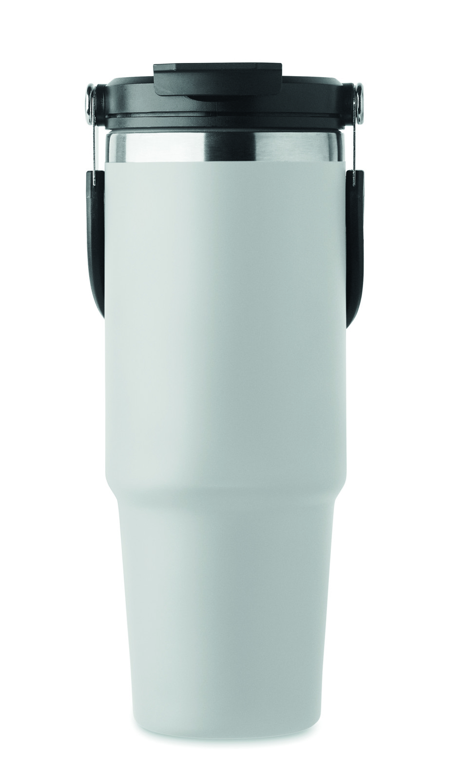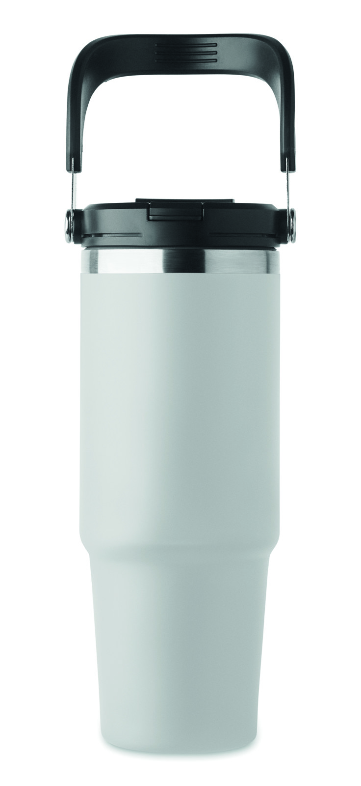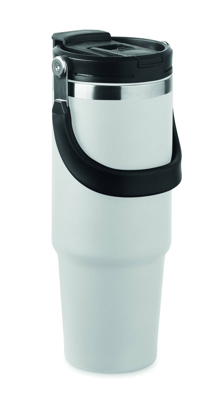 Doppelwandiger Trinkbecher aus recyceltem Edelstahl (90 % recycelter Edelstahl und 10 % Edelstahl). Verschluss mit integriertem Trinkhalm und klappbarer Trinköffnung. Füllmenge: 850 ml.