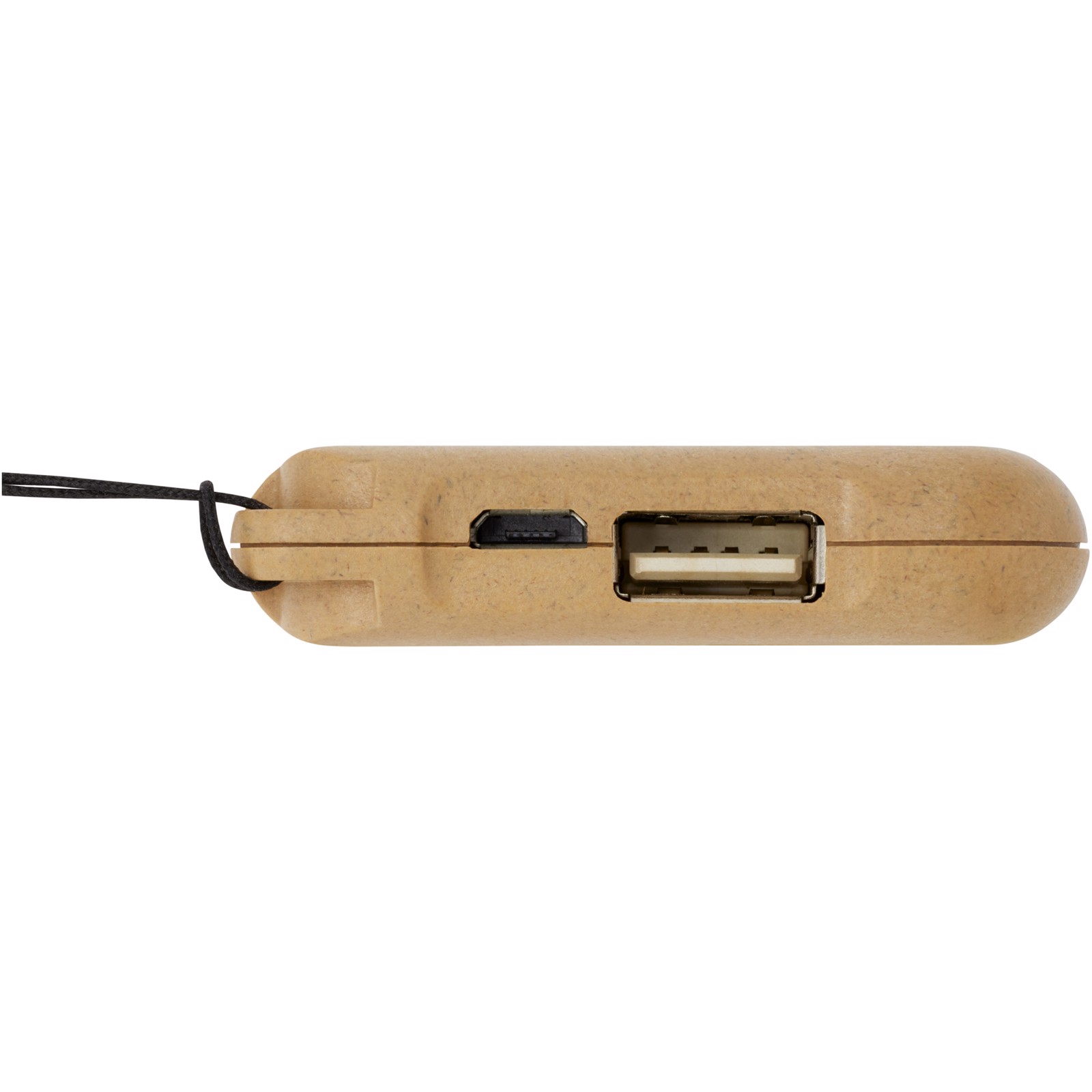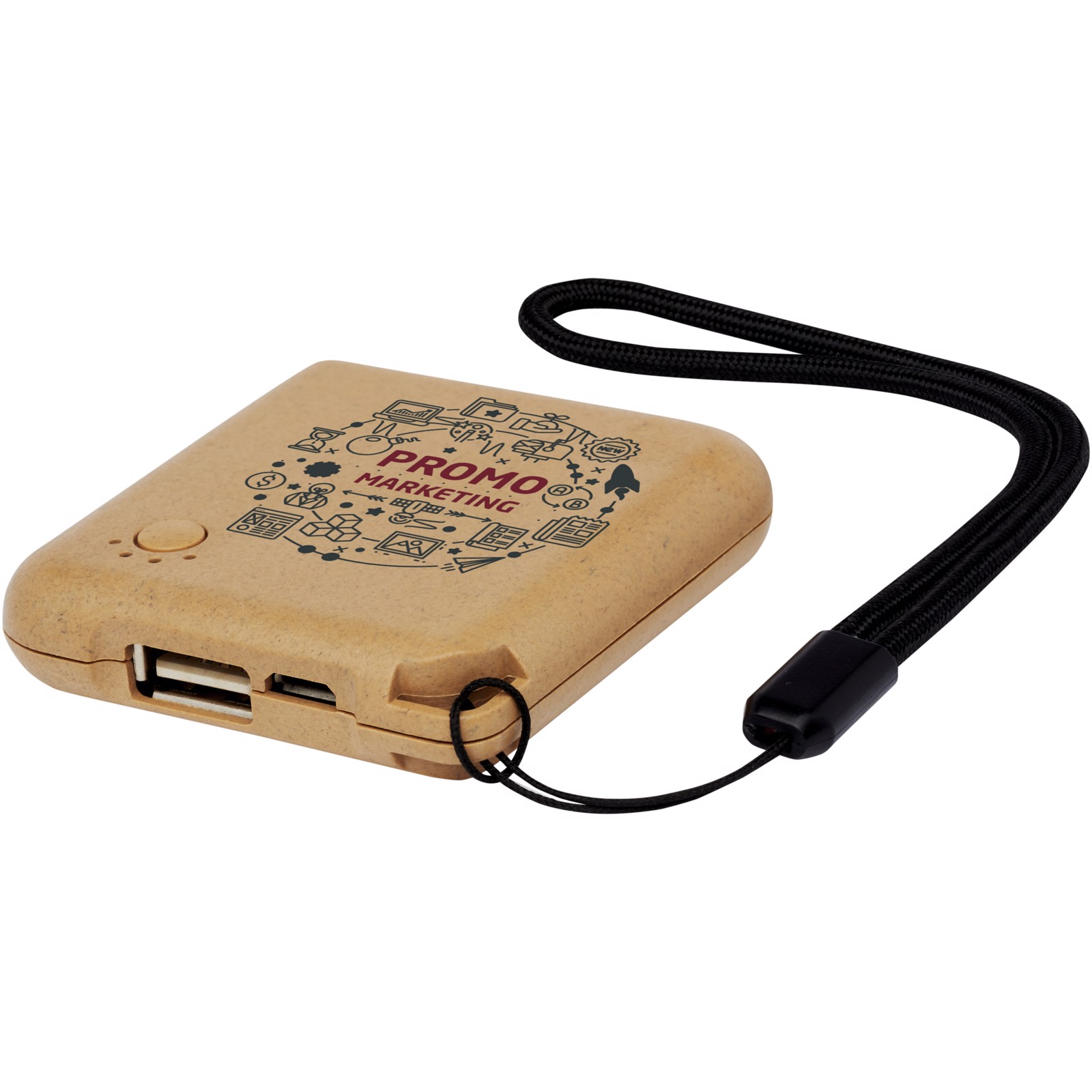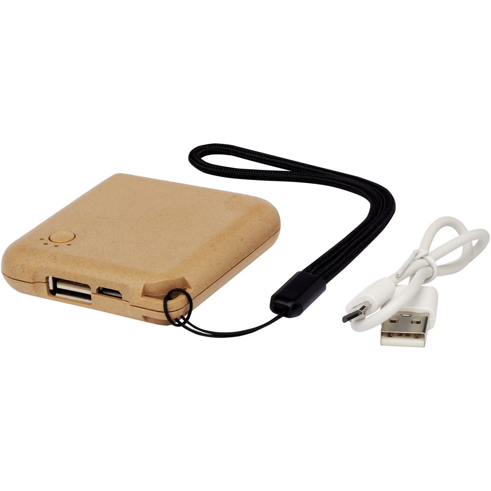 Kompakte Powerbank aus biologisch abbaubarem Kunststoff mit einer praktischen Öse zur einfachen Befestigung. Ladekabel im Lieferumfang enthalten. Input: DC 5V/500 mA. Output 1: DC 5V/1000 mA. Batterie: Lithium-Ionen-Polymer.