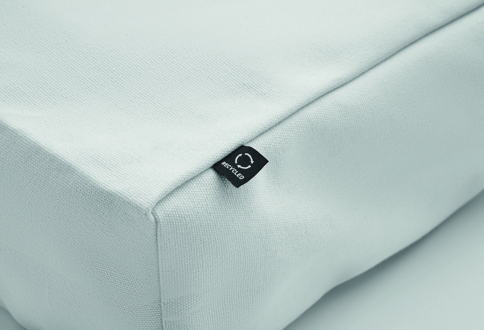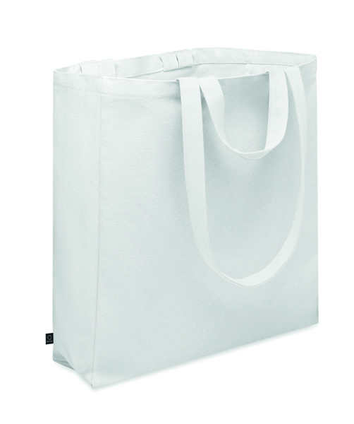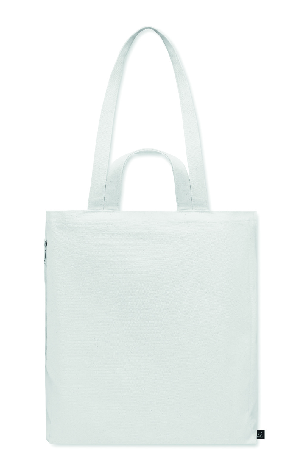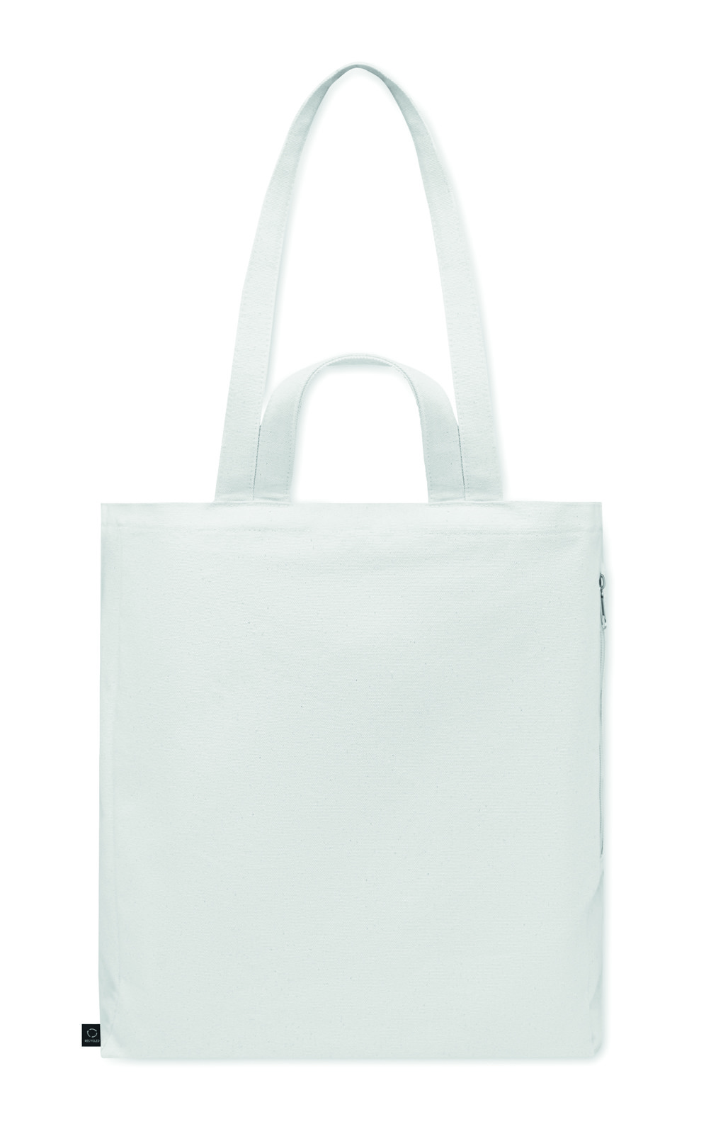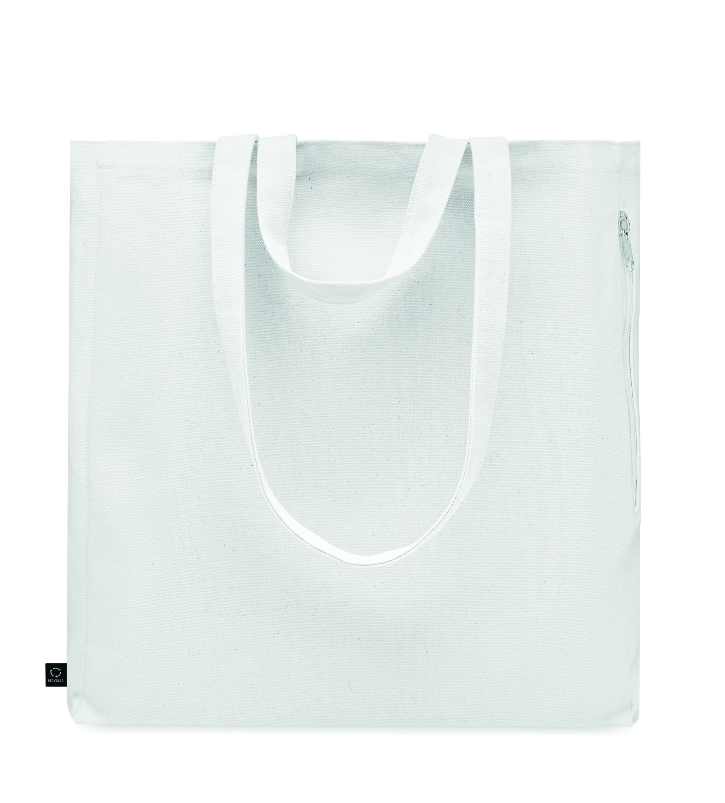 Einkaufs- oder Strandtasche aus recyceltem Polycotton (70 % recycelte Baumwolle, 30 % recycelter Polyester) mit kurzen Tragegriffen. Innentasche mit Reißverschluss. 380 g/m².