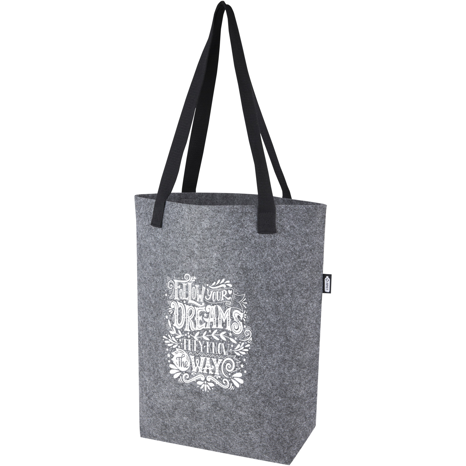 Praktische Tragetasche aus weichem und strapazierfähigem GRS-zertifiziertem, recyceltem Filz. Mit langen gewebten Baumwollgriffen (30 x 2,5 cm) für optimalen Tragekomfort und einem extra breiten Boden für maximalen Stauraum.