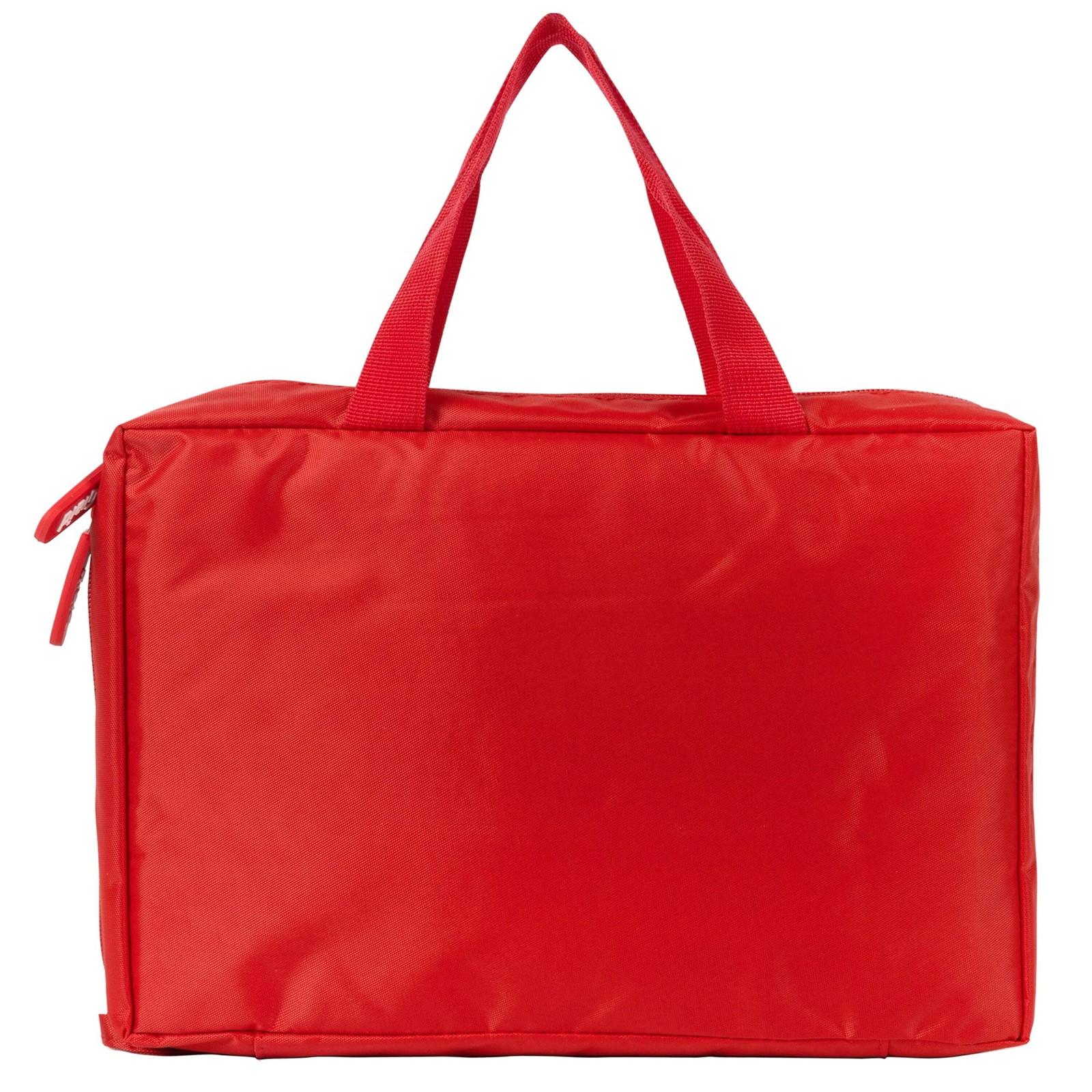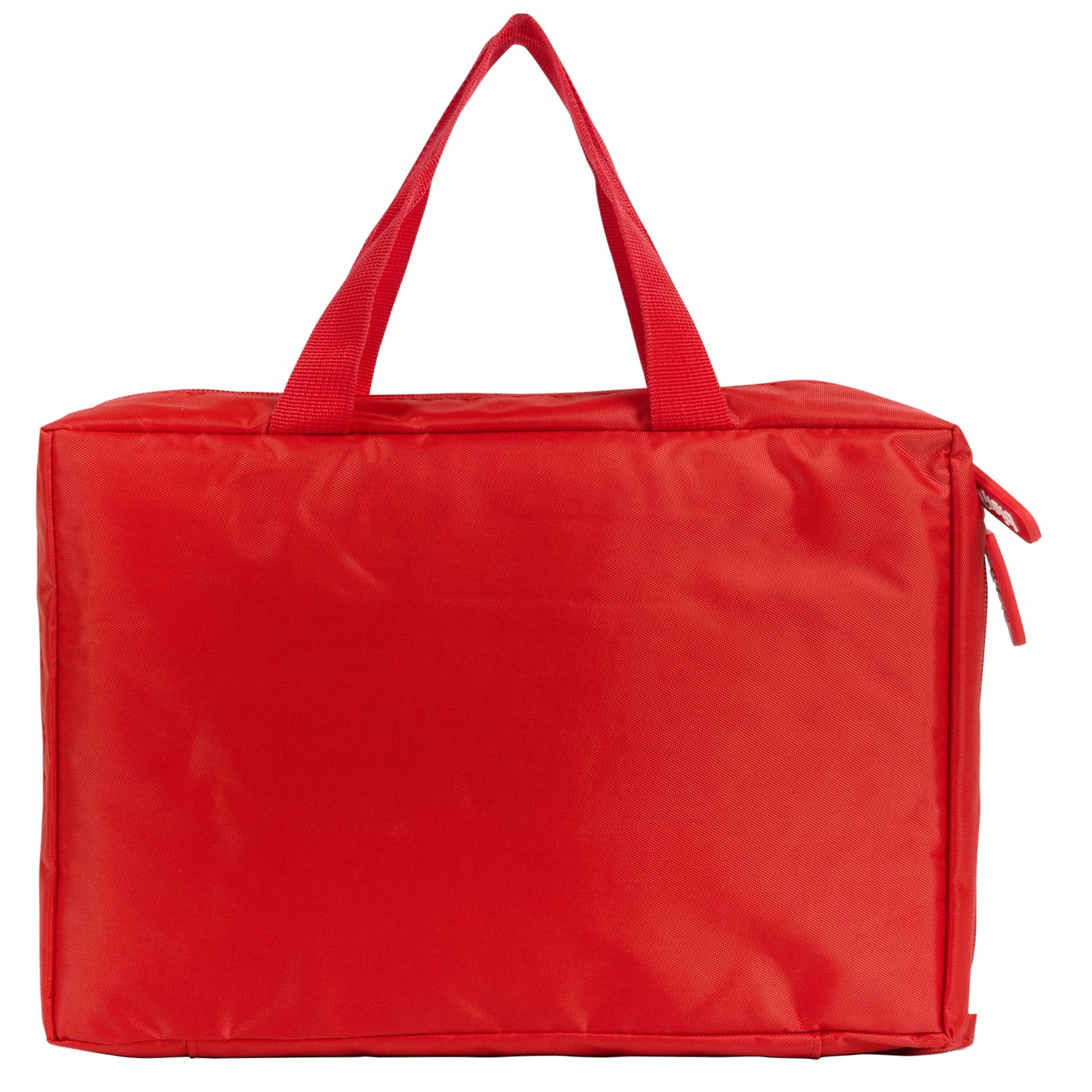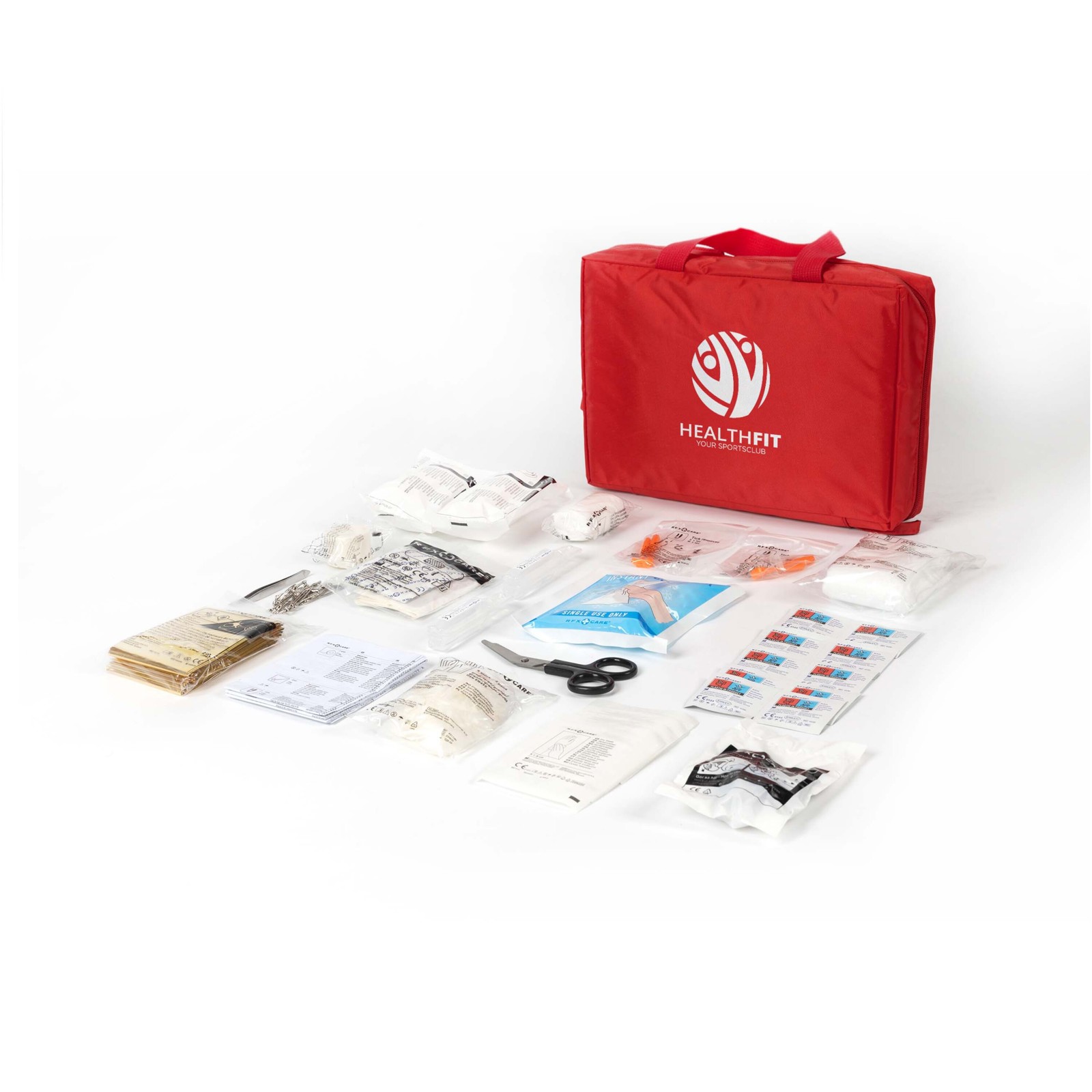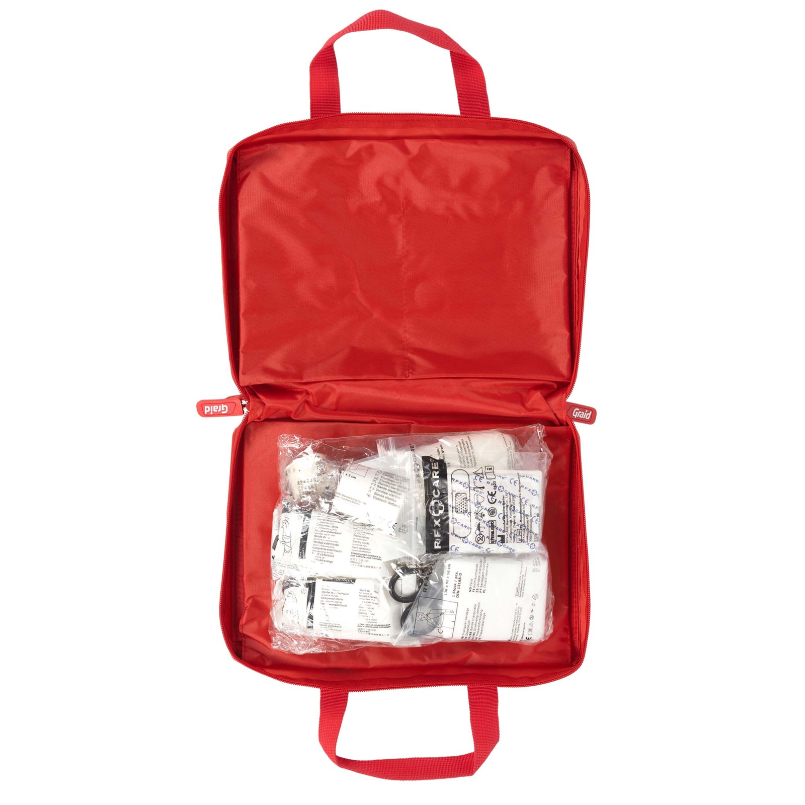 MDR-Klasse 2a: Erste-Hilfe-Set. Die Nylontasche enthält 102 Erste-Hilfe-Artikel mit einer Haltbarkeit von 5 Jahren, darunter: 40 wasserfeste Pflaster, 20 Pflaster, 10 Sicherheitsnadeln, 10 NaCl-0,9 %-Tücher, 2 Blasenpflaster, 2 Erste-Hilfe-Verbände, 2 trockene Tupfer, 2 sterile Kochsalzlösungen, 2 Wundkompressen, 1 elastische Binde, 1 Paar Einweghandschuhe, 1 Dreieckstuch, 1 kleine Verbandsschere, 1 Pinzette aus Metall, 1 Rettungsdecke, 1 Kühlkompresse, 1 Atemschutzmaske, 1 Brandgelverband, 1 Wundnahtstreifen, 1 Heftpflasterrolle und 1 Gebrauchsanleitung.
