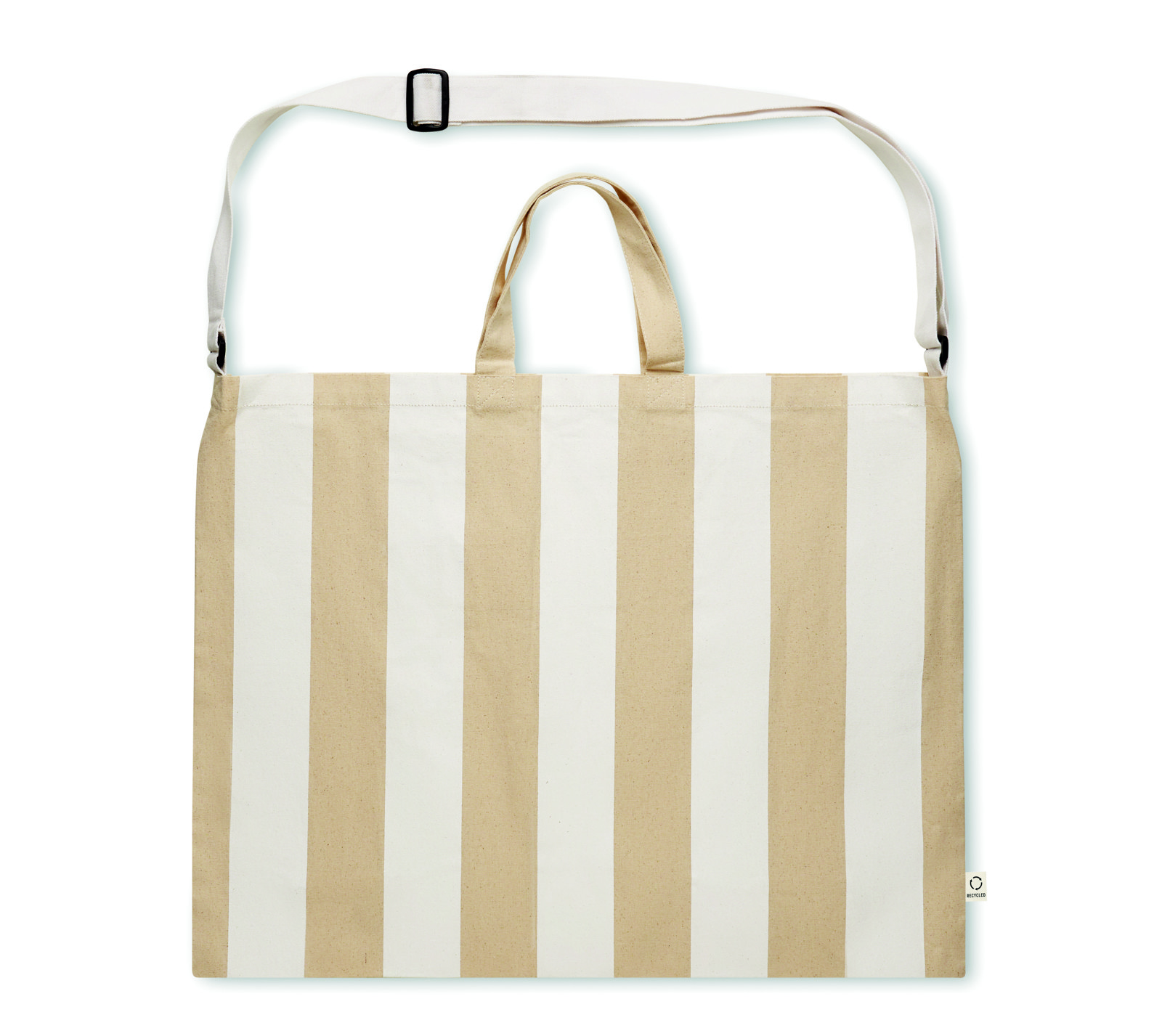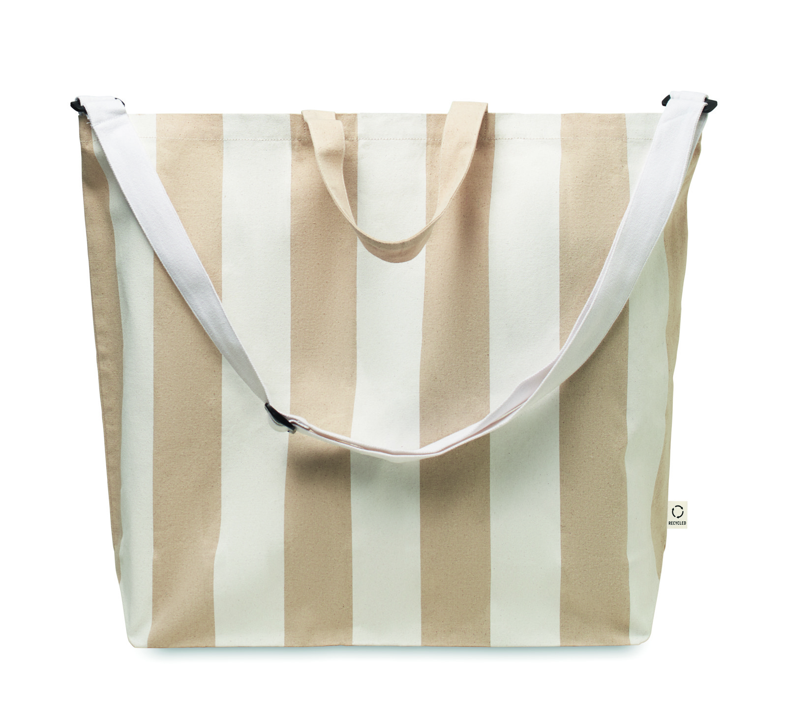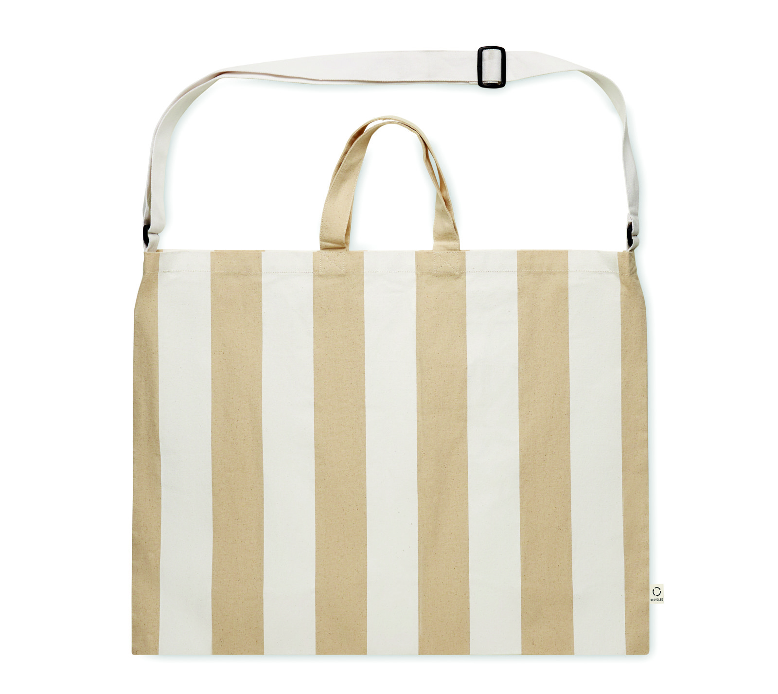 Extra große gestreifte Strandtasche aus 280 g/m² (recycelte Baumwolle 80% und recycelter Polyester 20%). Innentasche, kurze Tragegriffe und großer verstellbarer Schultergurt.