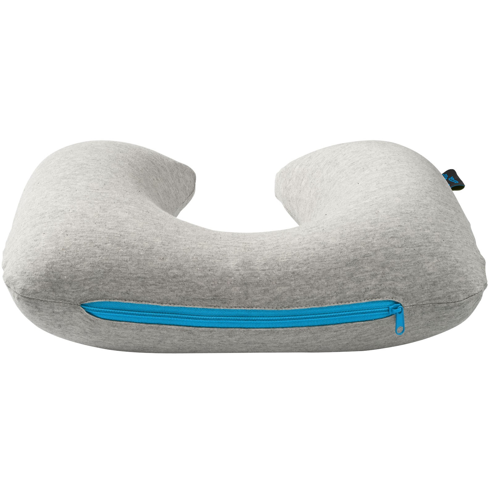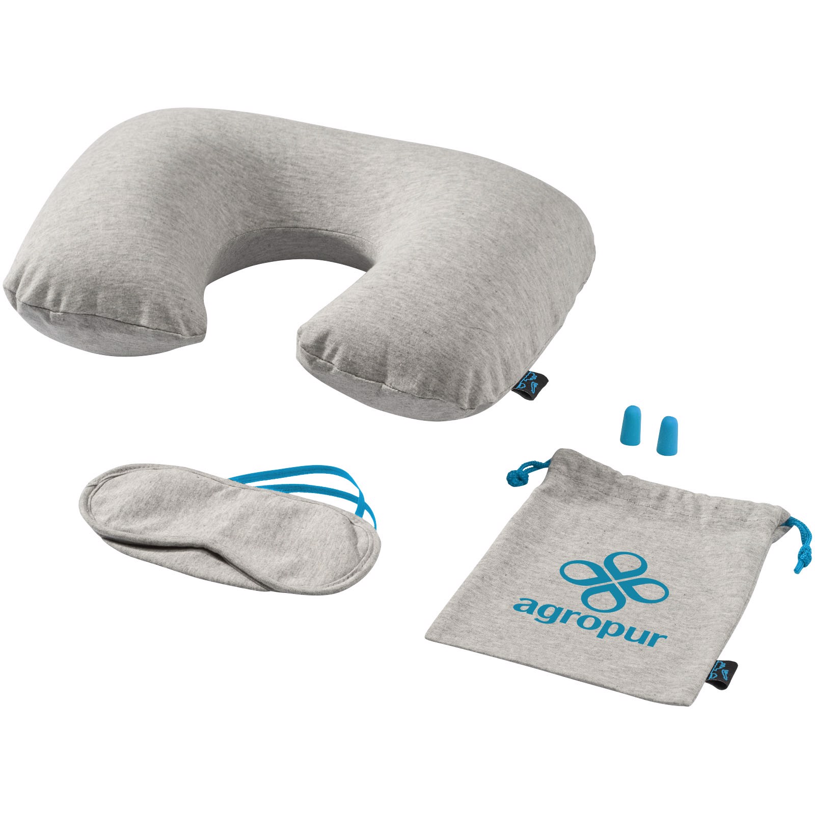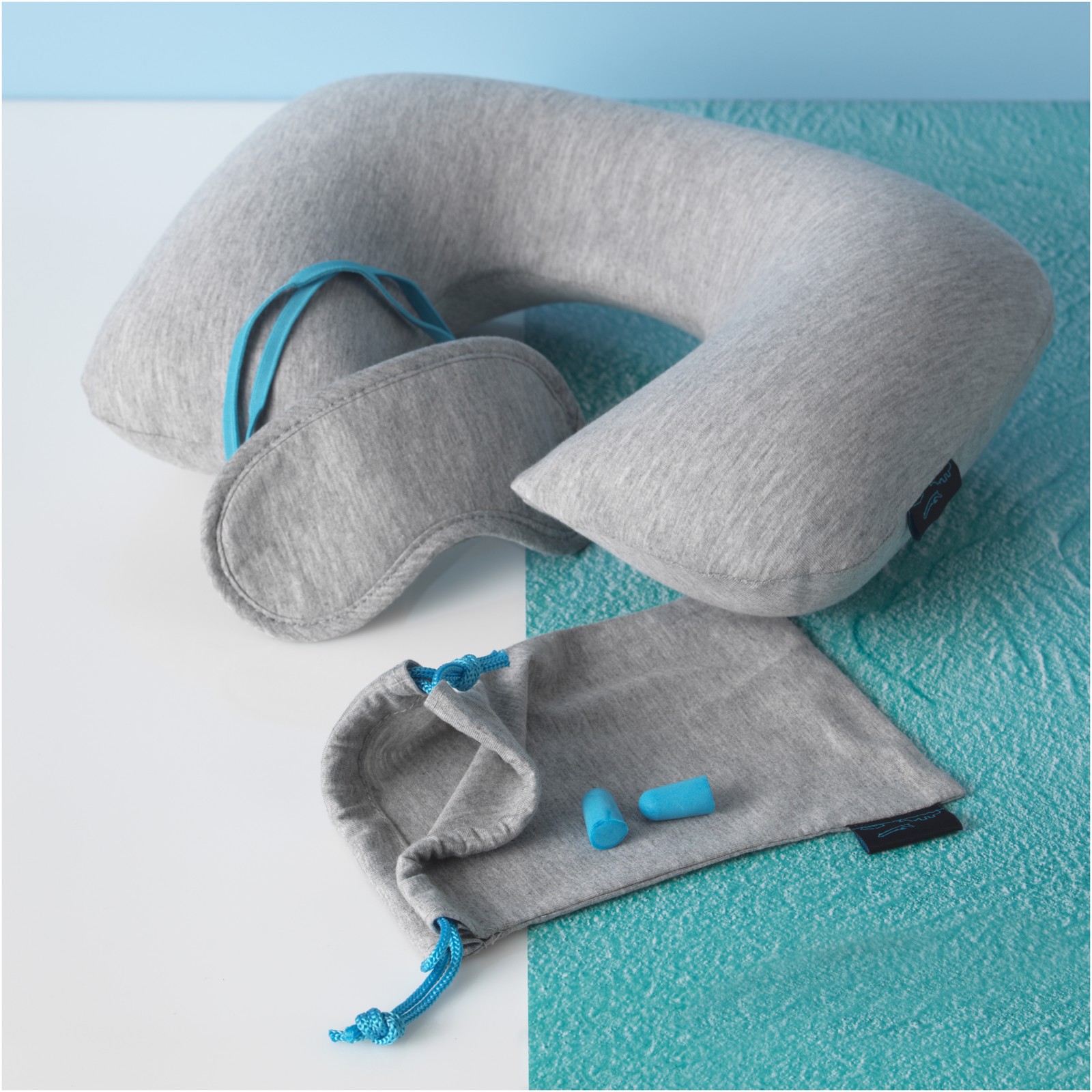 Soft Reiseset enthält ein aufblasbares Nackenkissen mit hellblauem Reißverschluss, Augenmaske mit hellblauem Gummi, hellblaue Ohrstöpsel und eine Softhülle mit hellblauem Kordelzugverschluss. (Zubehör nicht in Softhülle gepackt).