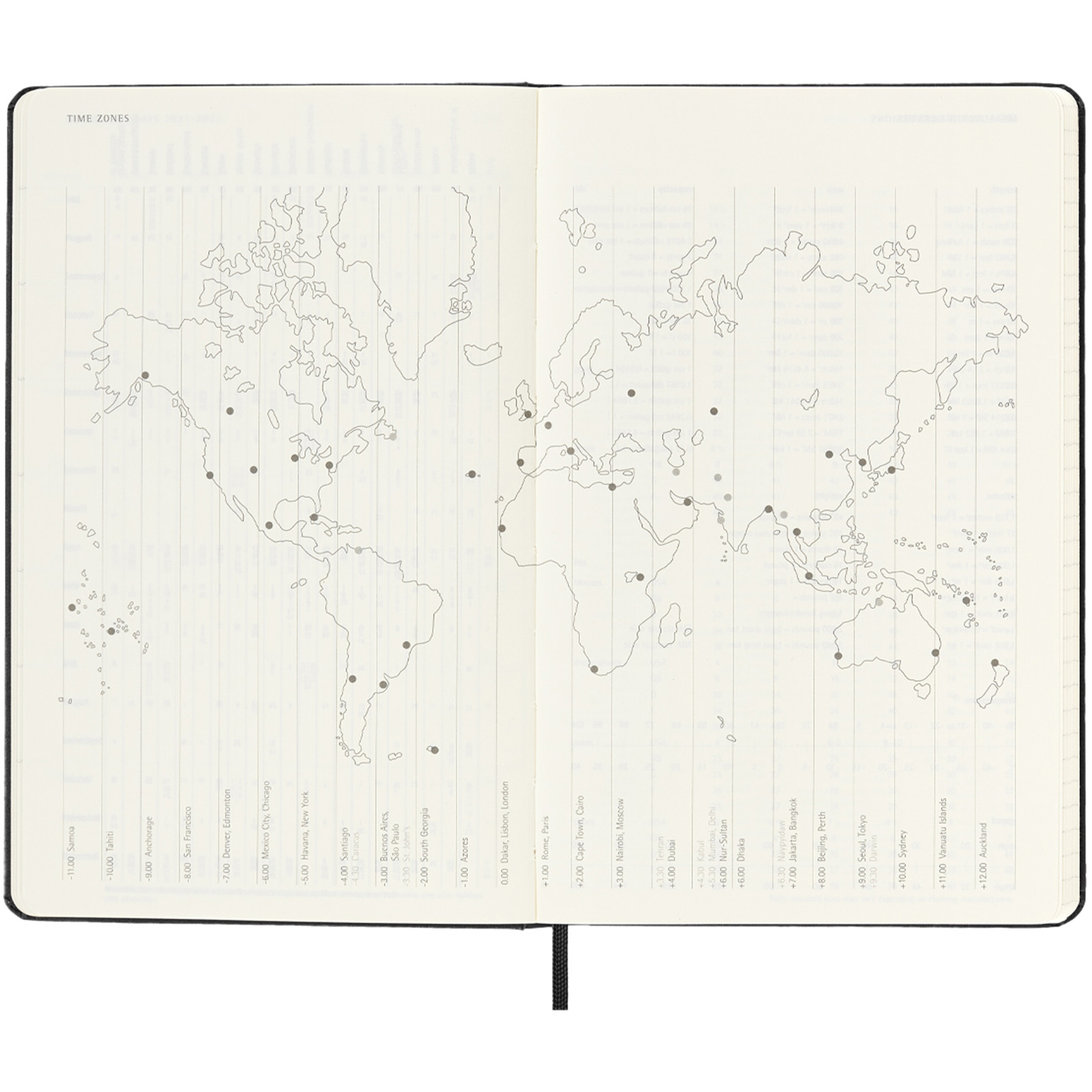 Moleskine Hardcover Tageskalender, von Januar bis Dezember 2024 datiert,Tagesansicht pro Seite. Innen mitKlebeetiketten, verwendbar um wichtige Termine und Deadlines zu markieren. Der Kalender bietet nützliche Tools, wie Zeitzonen, internationale Maße, Vorwahlen und Flugdauern. Mit elfenbeinweißem, säurefreiem Papier (70 g/m²), schwarzem Gummibandverschluss, Lesezeichenband und erweiterbarer Innentasche.