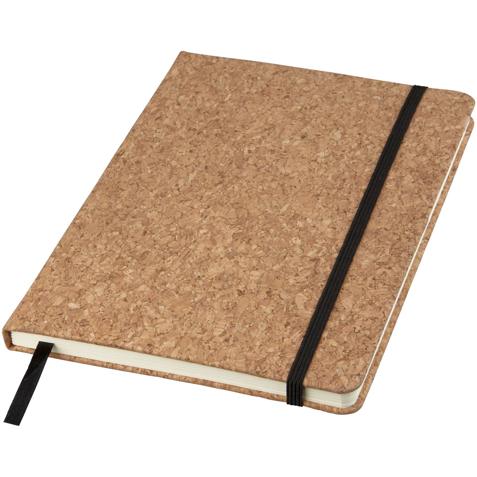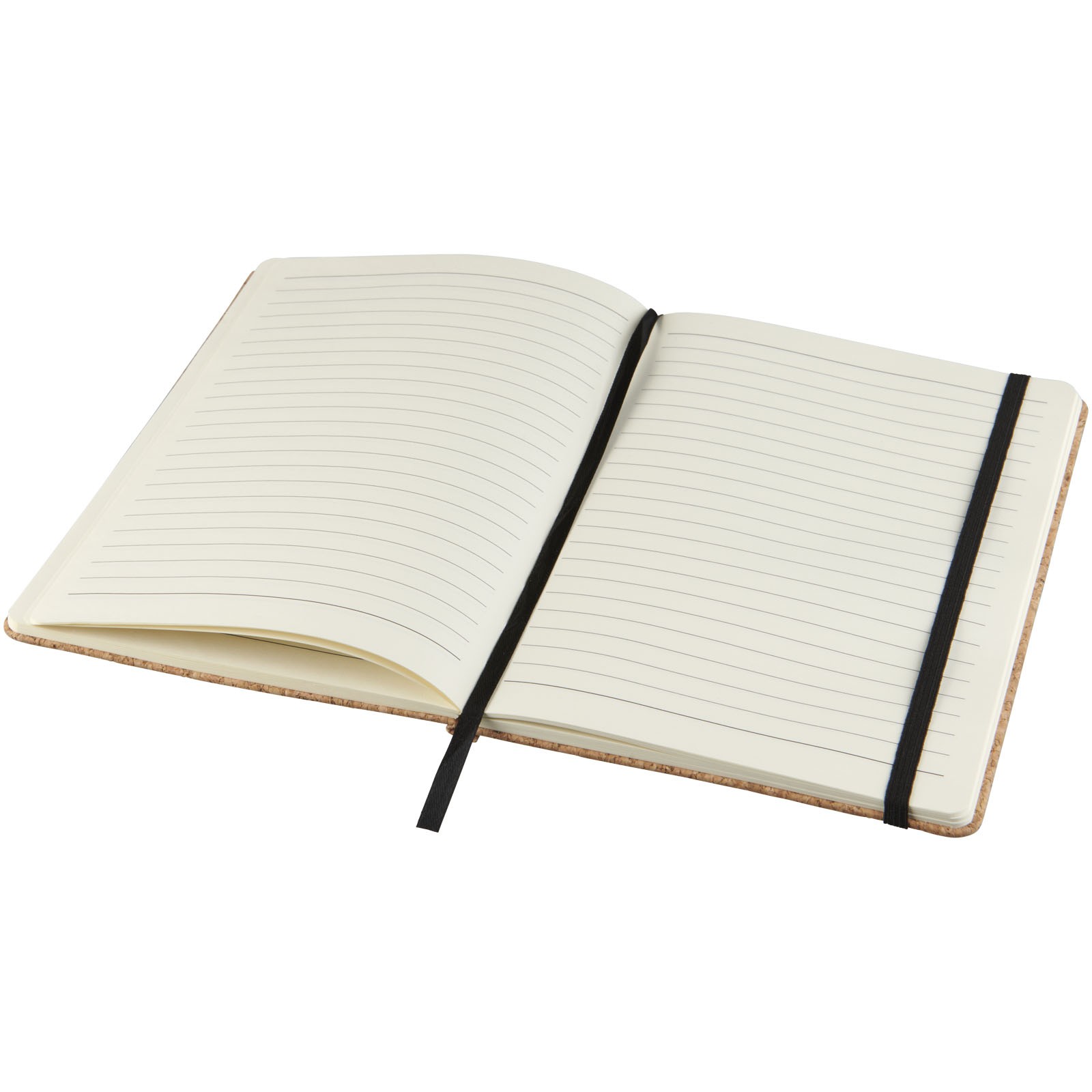 Ein Notizbuch in der Größe A5 mit Korkeinband, schwarzem Gummi und Band. Mit 80 Blatt liniertem 70 g/m² Papier.