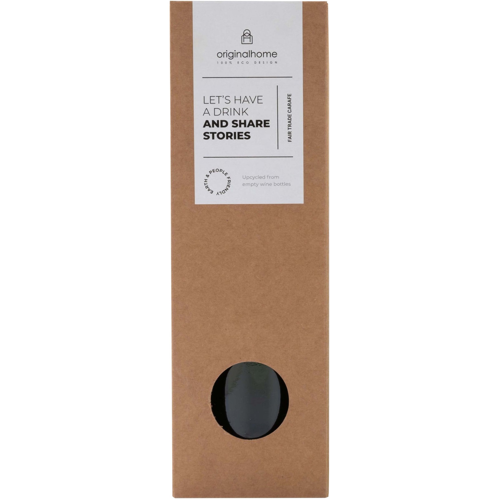 Handgefertigte 750 ml Wasserkaraffe aus upcycelten Weinflaschen aus Sansibar, Tansania. Die Weinflaschen werden von Hotels, Restaurants und Bars eingesammelt und dann sortiert, gereinigt und in verschiedene Formen und Größen geschnitten. In einem Geschenkkarton geliefert.