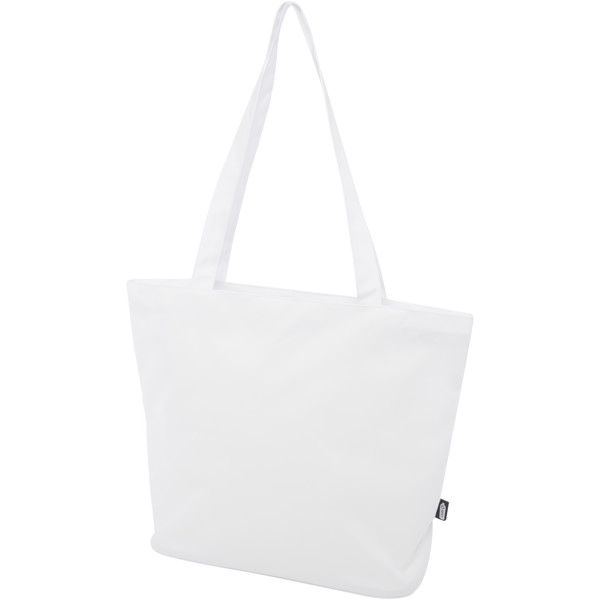 Die Panama GRS-recycelte Tragetasche mit Reißverschluss aus wasserabweisendem 600D RPET ist eine perfekte Mehrzwecktasche für den Besuch einer Veranstaltung, für den Strand oder für den Lebensmitteleinkauf. Sie verfügt über ein Hauptfach mit Reißverschluss und eine Innentasche mit Reißverschluss, die groß genug ist, um Ihr Telefon und andere wertvolle Gegenstände zu verstauen. Die Griffe sind 34 cm lang, sodass die Tasche leicht über der Schulter getragen werden kann. Belastbarkeit bis zu 10 kg. PVC frei.