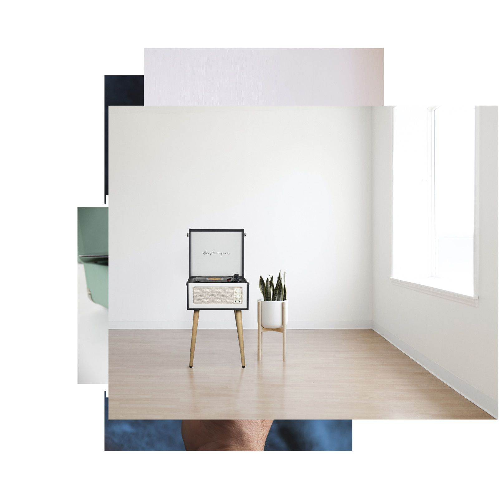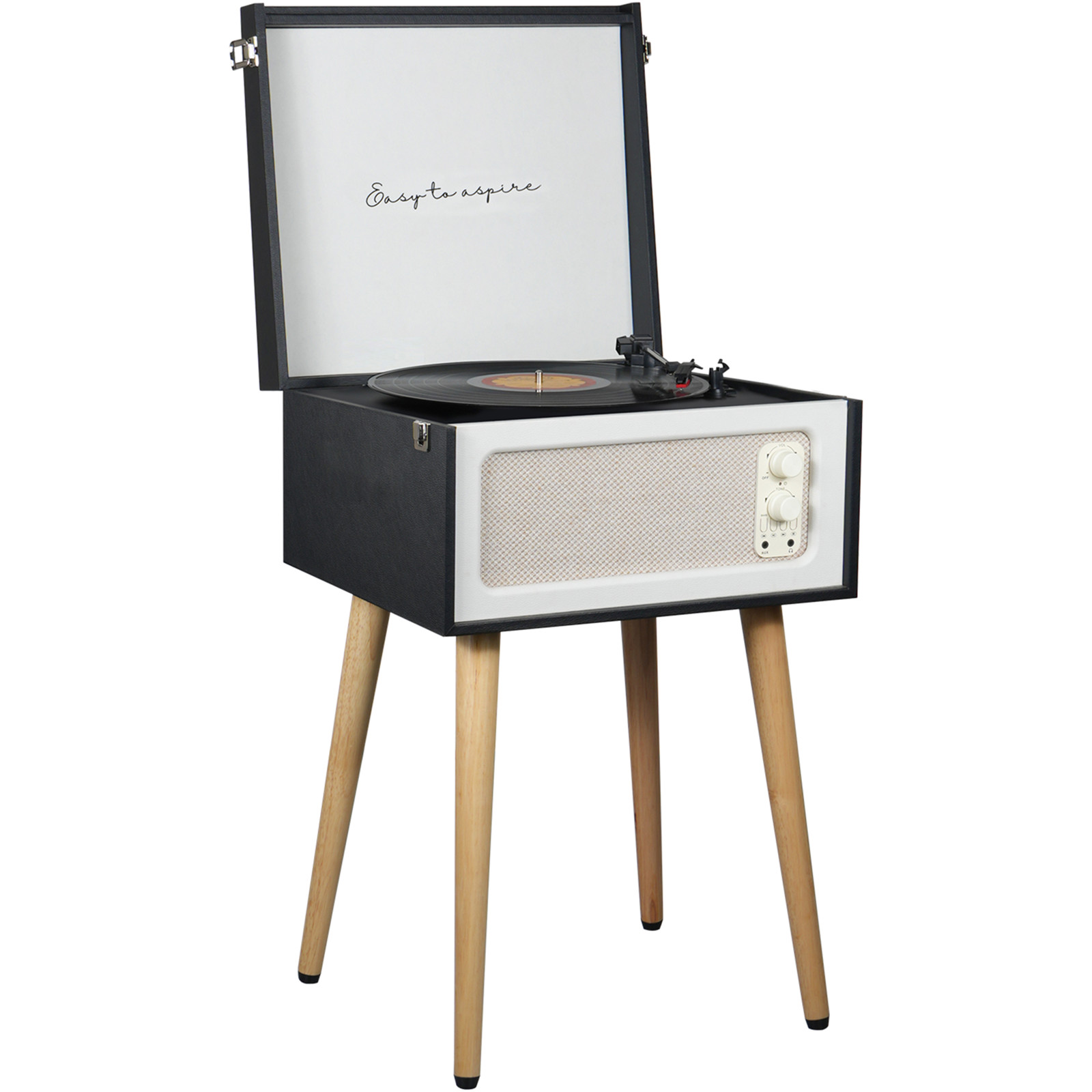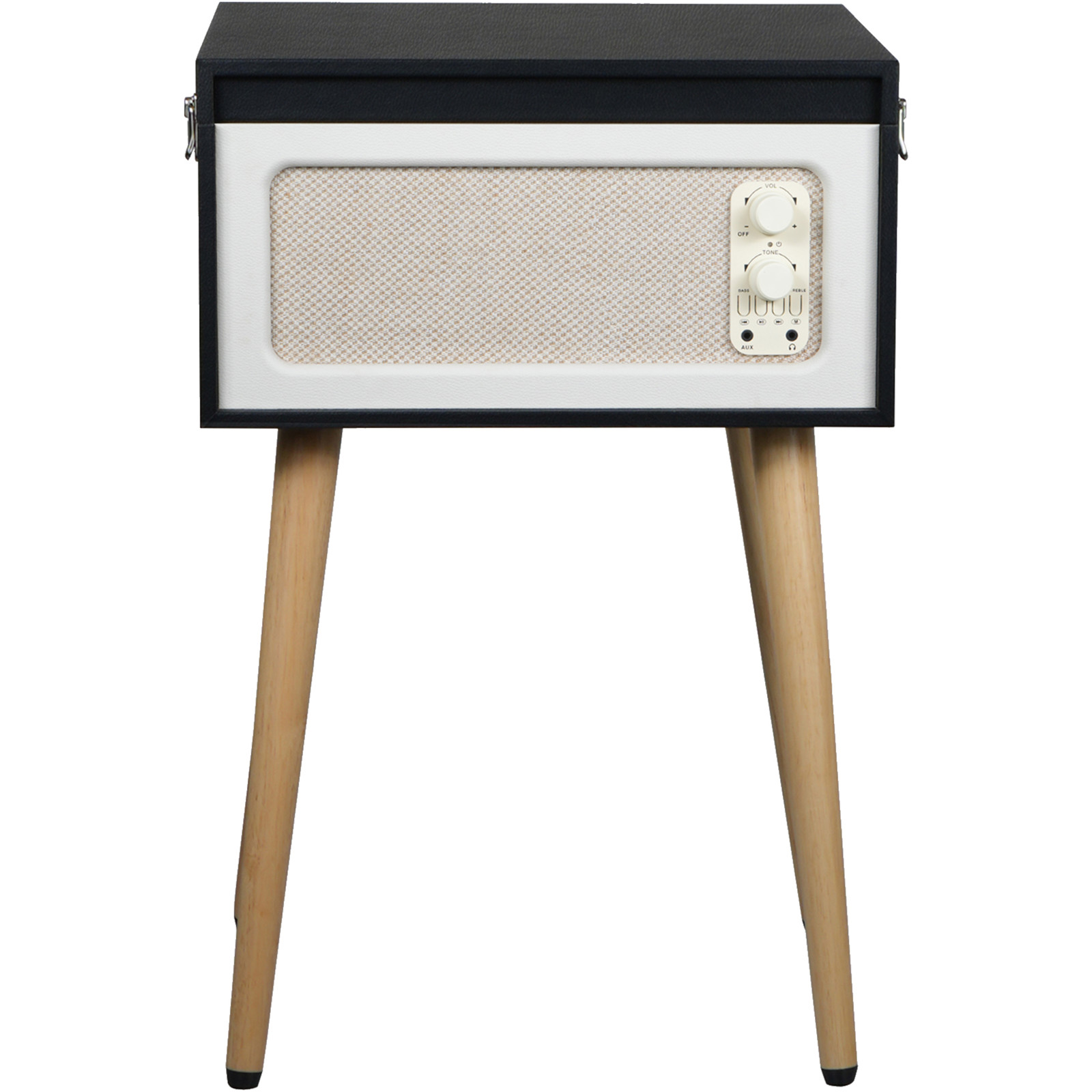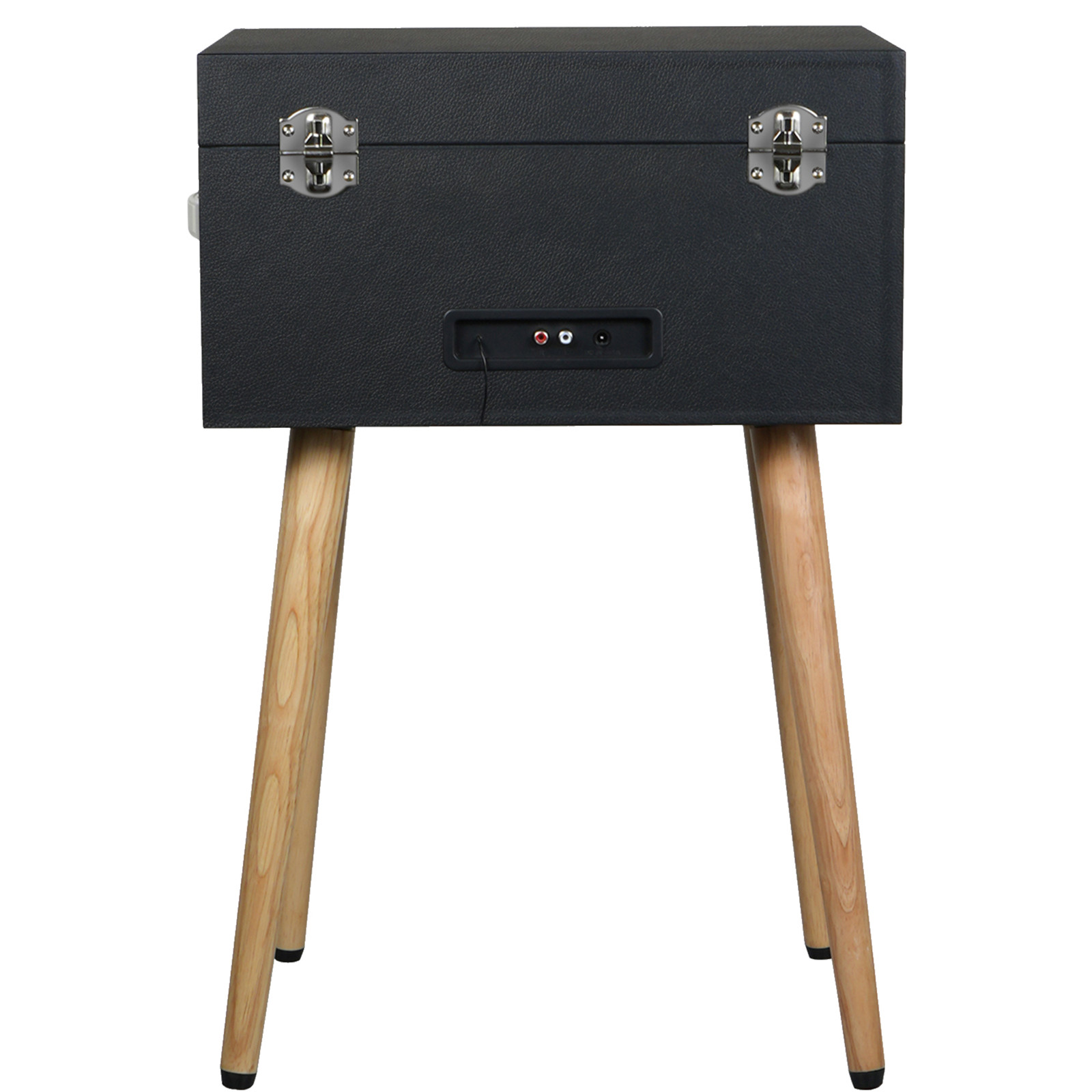 Vinyl-Plattenspieler mit 2 Lautsprechern mit je 5W. Er verfügt über ein integriertes FM-Radio und eine drahtlose Bluetooth® 5.0-Verbindung, um Geräte zu verbinden und Musik abzuspielen, sowie über 2 RCA-Audio- und Kopfhörerausgänge. Der Plattenspieler enthält eine Rubinnadel und eine Staubkappe. Vintage-Design mit Holzbeinen.