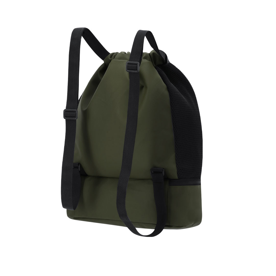 Rucksack aus weichem PU mit Hauptfach mit Kordelverschluss und einer kleinen Innentasche mit Reißverschluss. Enthält eine Tasche im Boden für die Schuhe mit doppelt Reißverschluss und vorderen Taschen mit leicht zugänglichem Reißverschluss. Mit atmungsaktiven Seitenteilen und verstellbaren Schulterriemen. Schuh Staufach