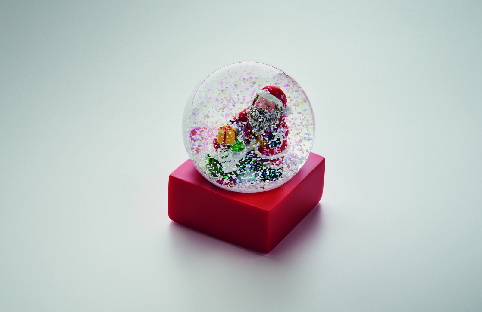 Weihnachtliche Schneekugel aus Glas mit Sockel aus Polyresin.