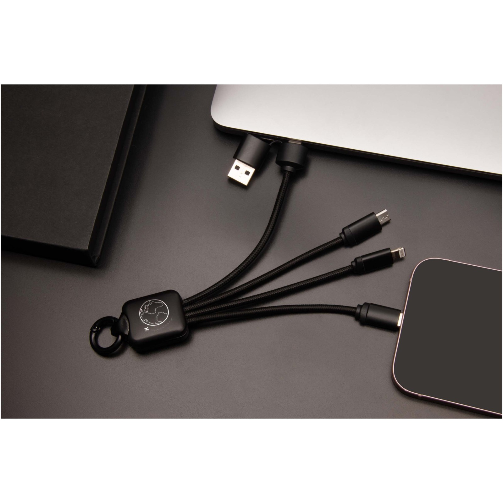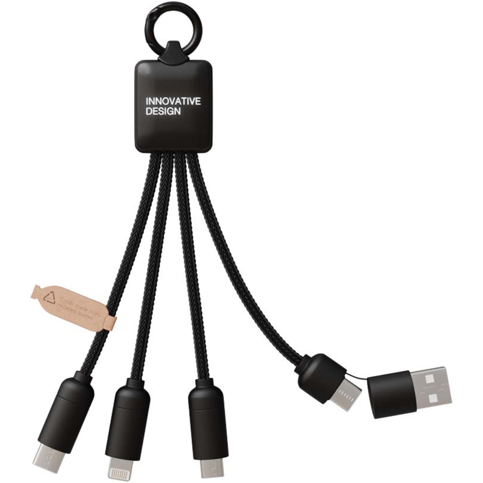 5-in-1 Ladekabel mit 3 Anschlüssen (Typ-C, Android, iPhone) und rPET-Kabeln (hergestellt aus recycelten Kunststoffflaschen). Der duale USB-A- und USB-C-Eingang macht das Kabel 100% kompatibel mit den neuesten Computermodellen (USB-C). Endkappen in Metalloptik. Das Kabel kann bis zu 3 Geräte gleichzeitig aufladen. Geliefert in einer recyclebaren Hülle und einer Karte aus recyceltem Papier.