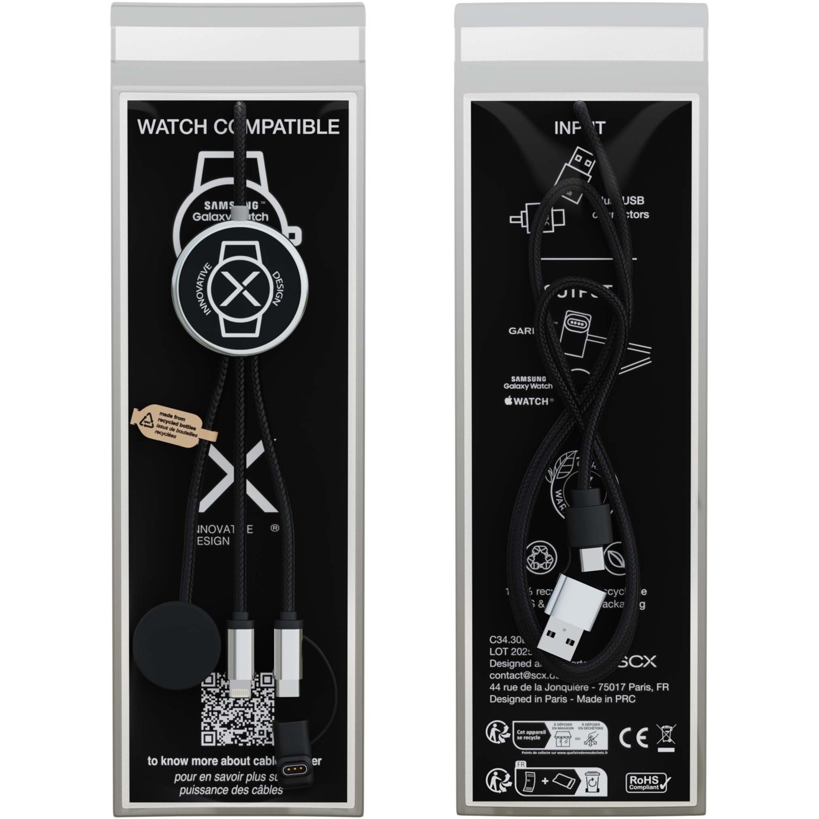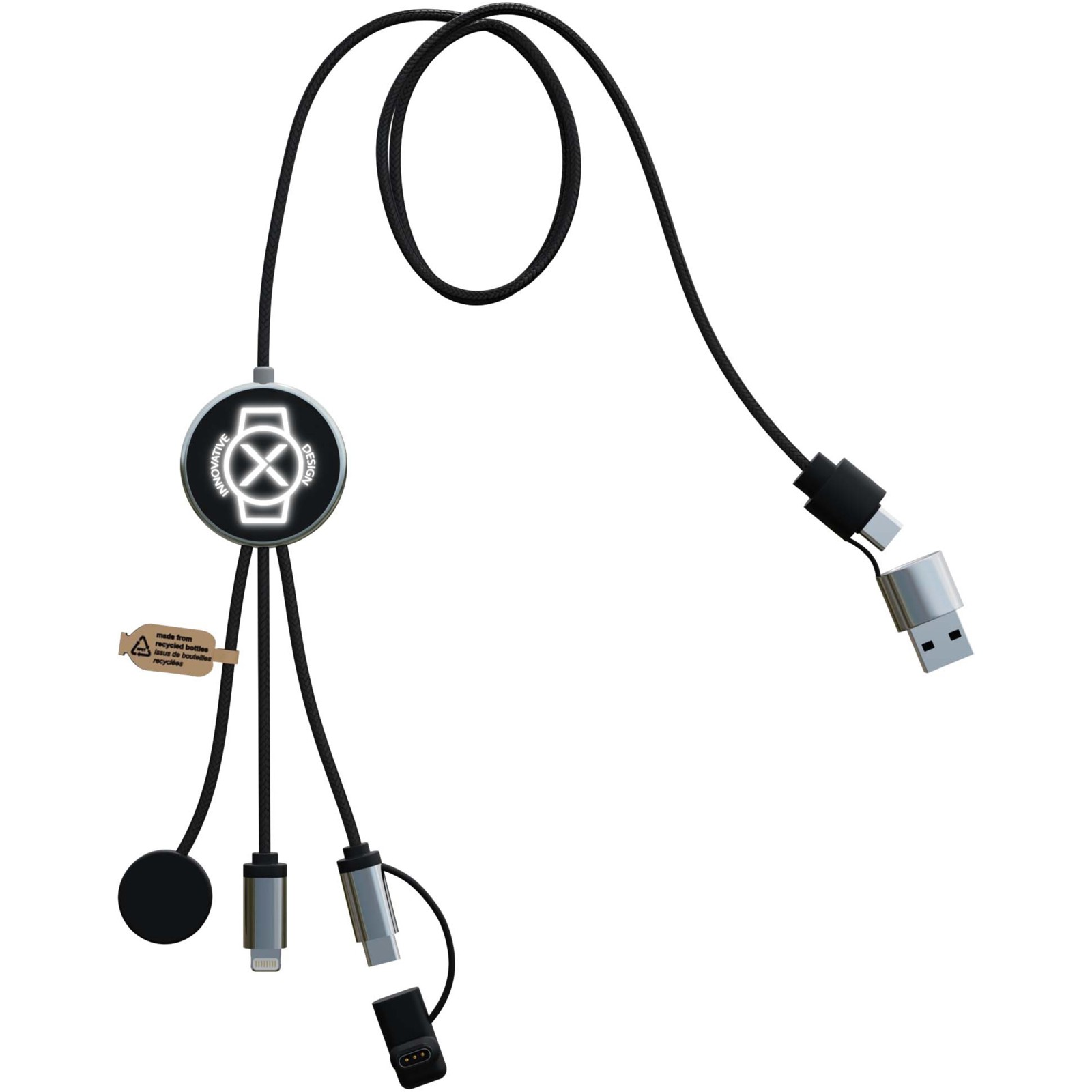 Dieses 7-in-1 Ladekabel wurde speziell für Smartwatches entwickelt und verfügt über fünf Ausgangsanschlüsse: Lightning, Typ C, Apple Watch, Samsung Watch und Garmin. Es bietet zwei Eingangsoptionen (USB-A und USB-C) und ist somit mit den neuesten USB-C Geräten und Computern kompatibel. Die Kabel sind aus recycelten Kunststoffflaschen hergestellt, und das Kabel kann zwei oder drei Geräte gleichzeitig aufladen. Lieferung mit individueller Frontgestaltung und Verpackung in einer recycelbaren TPU-Hülle mit einer Rückseite aus Recyclingpapier.