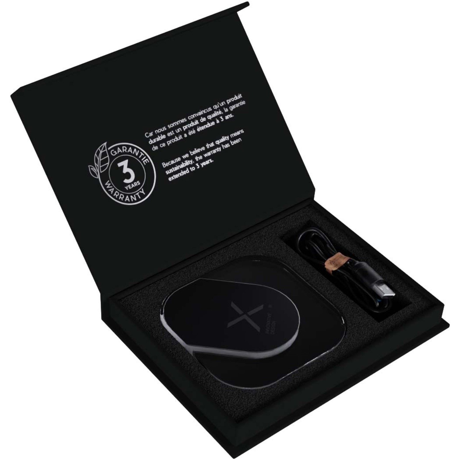 Transparente, kabellose Ladestation mit 15W und LED-Hintergrundbeleuchtung, die 30 bis 40 Sekunden lang leuchtet, wenn die Ladestation eingesteckt ist oder das Gerät aufgeladen wird. Dank neuester Technologie kann die Ladestation bis zu 15W kabellos aufladen (Wandladegerät nicht im Lieferumfang enthalten). Geliefert mit einem Ladekabel aus rPET (Ladegerät nicht im Lieferumfang enthalten) und einer Geschenkbox aus recyceltem Karton mit Magnetverschluss.