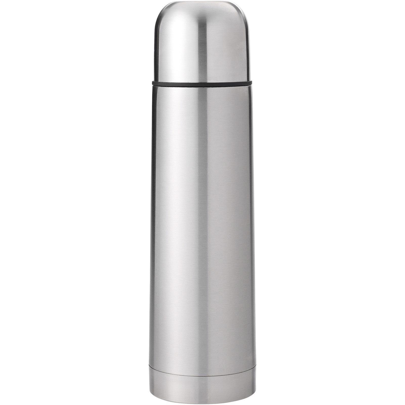Doppelwandige Isolierflasche mit Becher im Deckel. Ausgießer mit Einhand-Druckknopf, der sich automatisch schließt, wenn der Deckel auf die Flasche geschraubt wird. Volumen 750 ml.