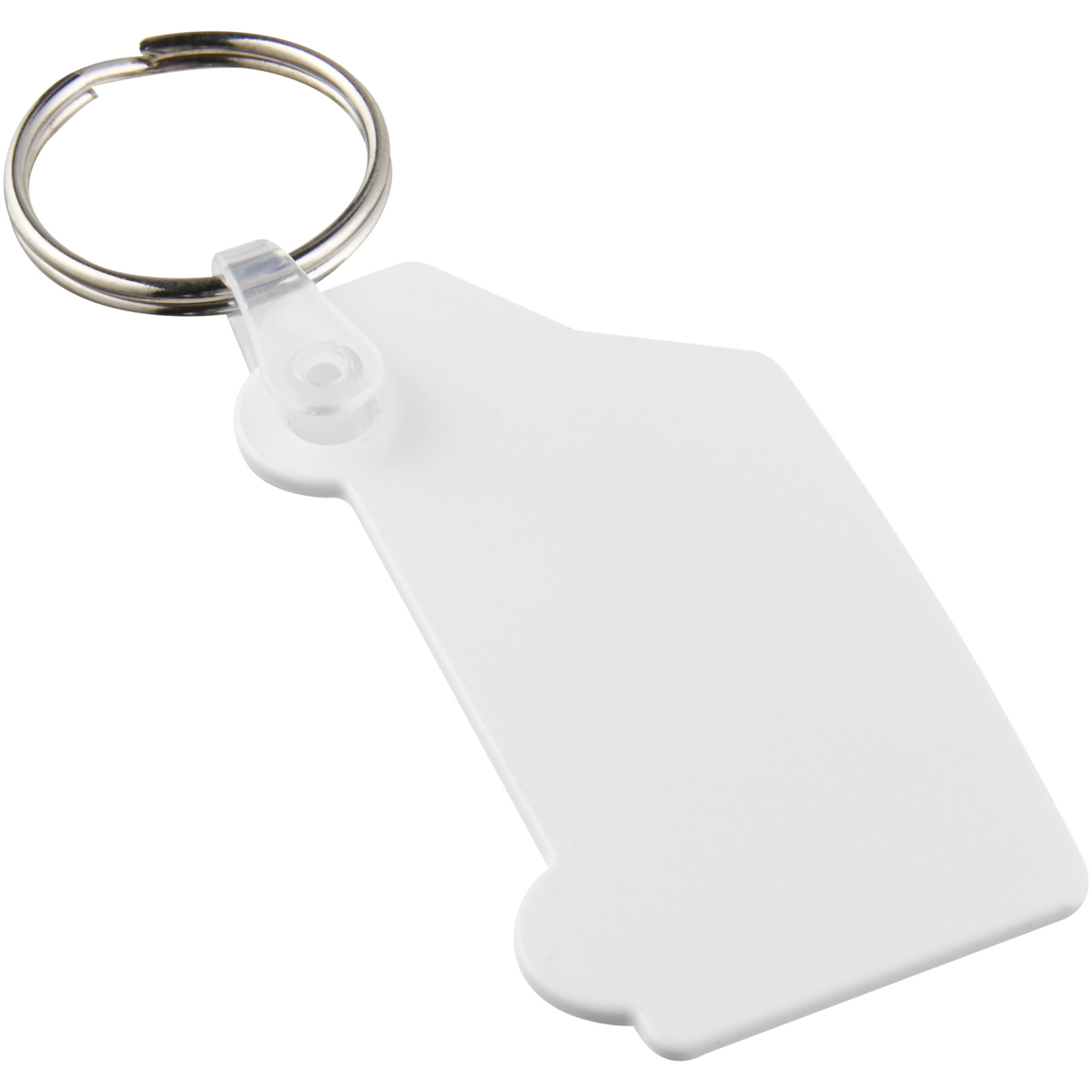 Weißer Schlüsselanhänger in Form eines Vans mit metallenem Schlüsselring. Der Metallring bietet ein flaches Profil, das sich ideal für Mailings eignet.